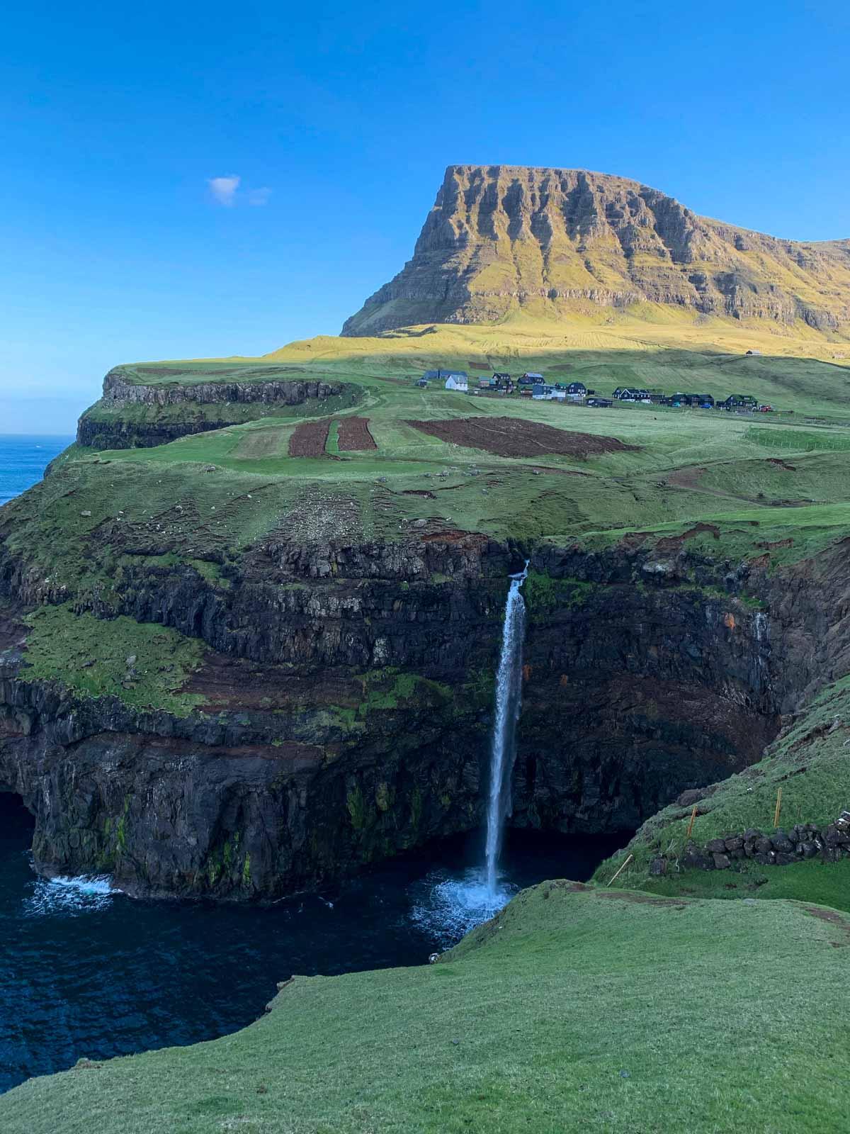 L’avion décolle à 9h pile de l’aéroport de Vagár. À partir du printemps et jusqu’en automne, le jour se lève tôt et l’on quitte l’hôtel Hilton Garden Inn à 6h30 pour Gásadalur ( « La vallée des oies »), qui malgré sa dizaine d’habitants est sans doute le village le plus connu de l’île. Ce n’est que depuis 2006 et le percement d’un tunnel qu’il est sorti de son isolement et devenu une star d’Instagram. La raison ? La cascade Múlafossur qui tombe directement dans la mer, surmontée du petit village et l’île de Mykines au loin. Une bonne raison de se lever tôt et d’admirer en toute solitude la vue, la dernière sur les Féroé avant son départ pour l’aéroport (15 min depuis le village).