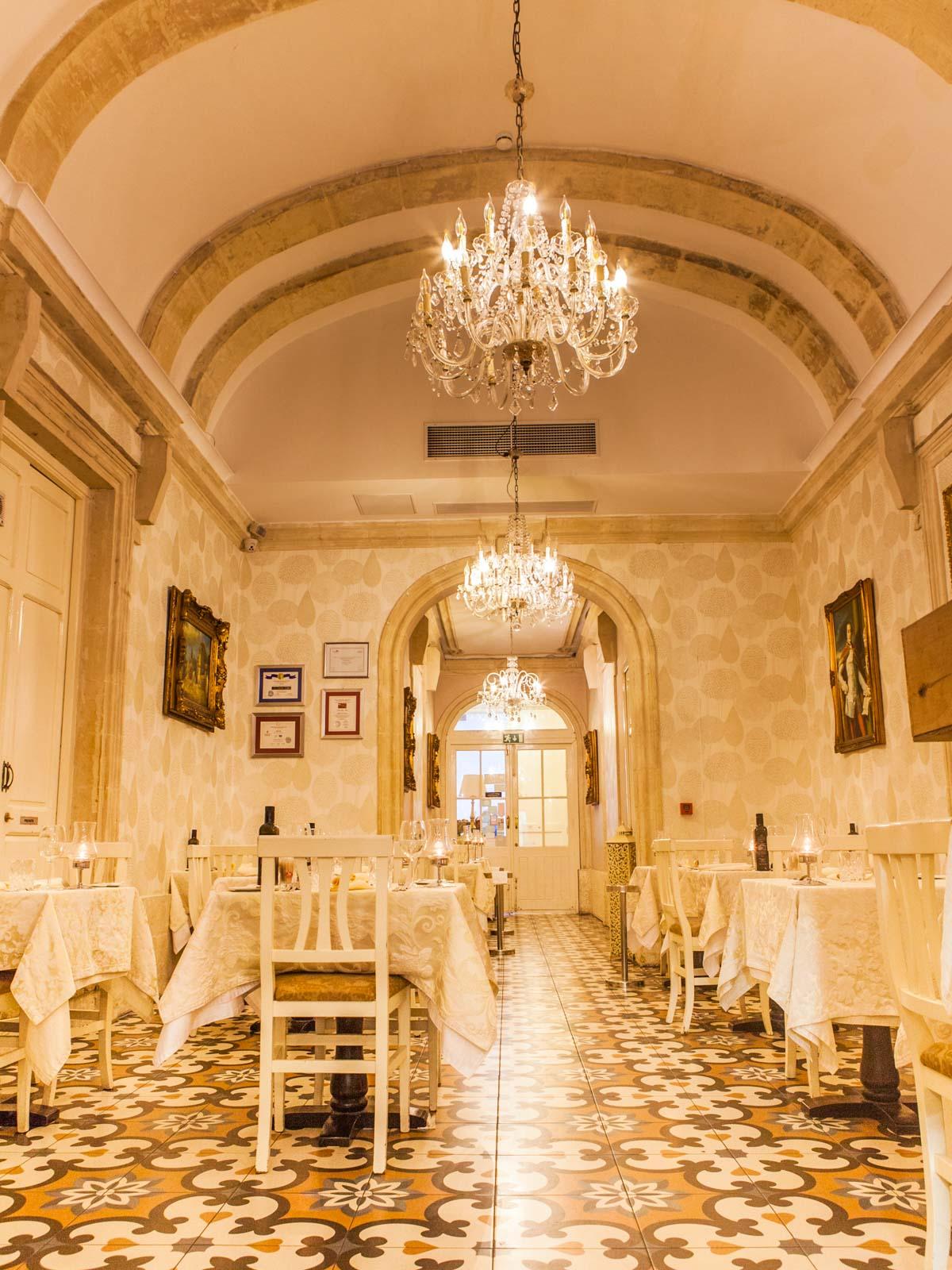 Après avoir acquis les ficelles du métier auprès de leur père restaurateur, Ramona et Roberta Preca ont pris leur envol dans ce palazzo du XVIe, qui conserve son carrelage d’origine et ses hauts plafonds aux poutres centenaires. Les murs en pierre, égayés de photos de famille, servent de cocon aux tables nappées de blanc. Poissons, coquillages et crustacés ; mais le plat phare reste le lapin à l’ail mariné au vin rouge.