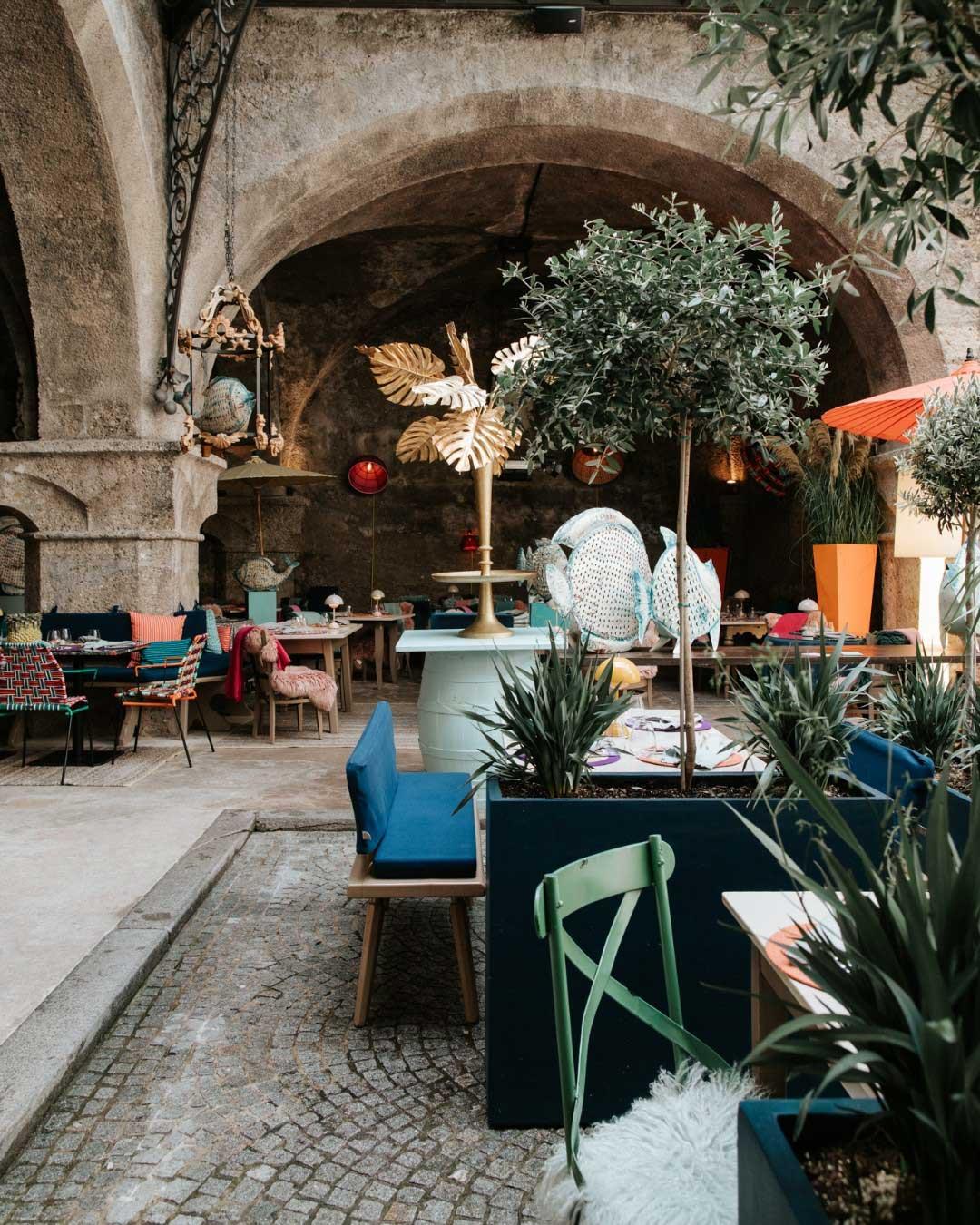 Le Blaue Gans est sur Getreidegasse, face au Palais des Festivals. Ses sols en marbre et ses portes baroques ont accueilli Mozart. Ils enveloppent aujourd’hui un design sûr. Tons coquille d'œuf, murs à la chaux, touches de bleu pétrole et de jaune canari participent à la théâtralité architecturale du bâtiment et au penchant d’aujourd’hui. Concomitance sans effort entre l'ancien et le nouveau. Plus de 120 œuvres d'art contemporain ont été réunies par le propriétaire. Les références et l'esthétique sont celles d'une galerie. Fidèle au nom de l'hôtel, « l'oie bleue » est partout. Des couloirs mènent à des coins et des recoins, à un atrium en verre, un jardin d'herbes aromatiques, une collection de livres d'art, aux chambres.