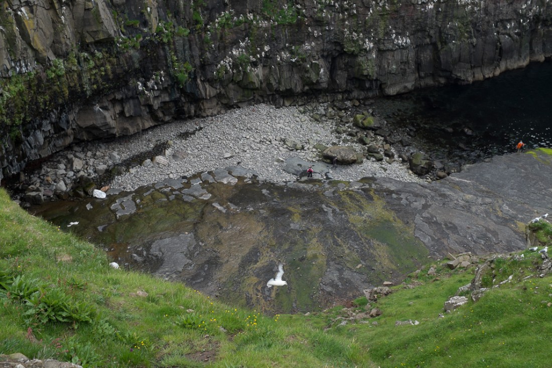 Vous l’avez compris, ces faits sont plus légendaires qu’historiques. Mais en parlant de légendes, Mikladalur est aussi le lieu d’une d’elles. Un marin s’était épris d’une femme-phoque et lui confisqua sa peau, sans laquelle elle était forcée de rester à terre. Ils vécurent comme mari et femme et eurent plusieurs enfants. Mais un beau jour, le marin oublia la clé de la commode dans laquelle il avait caché la peau. Sans surprise, il trouva la maison vide à son retour, sa femme ayant regagné la mer. L’histoire prend un tour encore plus sombre quand, contre les mises en garde, les marins du village tuent le nouveau mari phoque de la jeune femme et deux de ses fils phoques. Ceux-ci ne seront vengés que par la mort des hommes de Kalsoy, par noyade ou en chutant des falaises, et dans un nombre assez grand pour former une chaîne humaine tout autour de l’île ! En fait le mythe de la femme-phoque ou selkie est également répandu en Irlande et en Ecosse, particulièrement aux Shetland, soulignant une fois de plus la proximité culturelle des Féroé avec ces dernières.