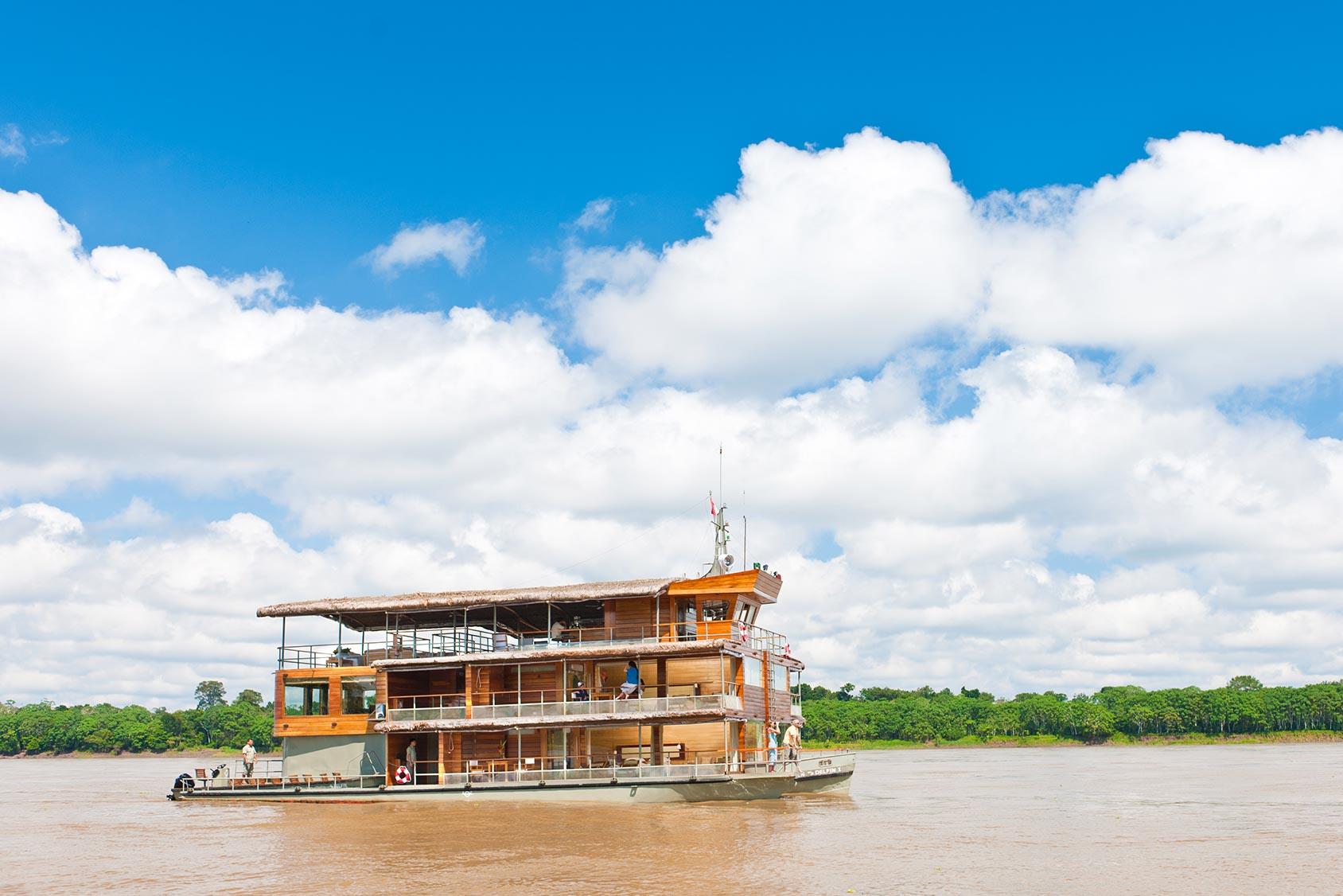 À Iquitos, l'embarquement sur le Delfin I marque le début d'une merveilleuse navigation. Le fleuve s’étire au loin, une pulsation lente qui traverse l’écrin vert de l’Amazonie. Iquitos, dernière sentinelle avant l’inconnu, se tient au bord de ce monde autre, une enclave bruyante au seuil du silence végétal. À bord d’un navire aux lignes épurées, tout semble suspendu lors de cet itinéraire au Pérou. Le bois luit sous la lumière mouvante des eaux, et les parois de verre invitent à profiter du spectacle. La jungle apparaît alors comme une cathédrale inversée, ses voûtes s’étendent vers le sol. Des lianes gigantesques pendent, immobiles ou presque, et les fleurs éclatent en couleurs impossibles. Il y a la moiteur, toujours, comme un souffle que la forêt elle-même retient. Des escales permettent d'explorer la jungle à pied ou en kayak, guidé par des experts dévoilant les mystères de cette nature sauvage : fleurs chatoyantes, félins furtifs.