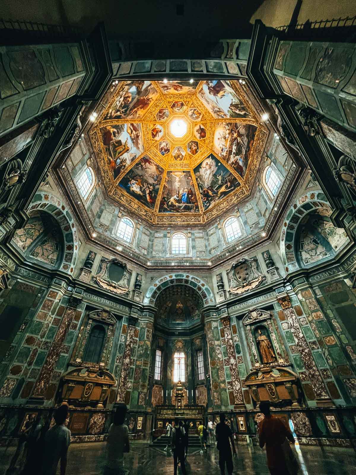 Ce matin avant le départ, une dernière visite à Florence s'impose. Derrière la Basilique San Lorenzo se trouve le lieu de sépulture de la famille des Médicis. Les chapelles des Médicis est un édifice qui comprend la Crypte qui abrite les reliques des Grands Ducs de la famille. Sa coupole monumentale repose sur un octogone dont les murs sont entièrement recouverts d’un décor en pietra dura : marbres polychromes, pierres semi-précieuses, jaspes, porphyre, albâtre, lapis-lazuli, coraux et bronze doré furent achetés dans toute l’Europe. L’extérieur sobre du monument inachevé était initialement un projet de Michel-Ange non abouti. Devant, la Basilique San Lorenzo de Florence, datant du IVe siècle, est une des plus anciennes de la ville.