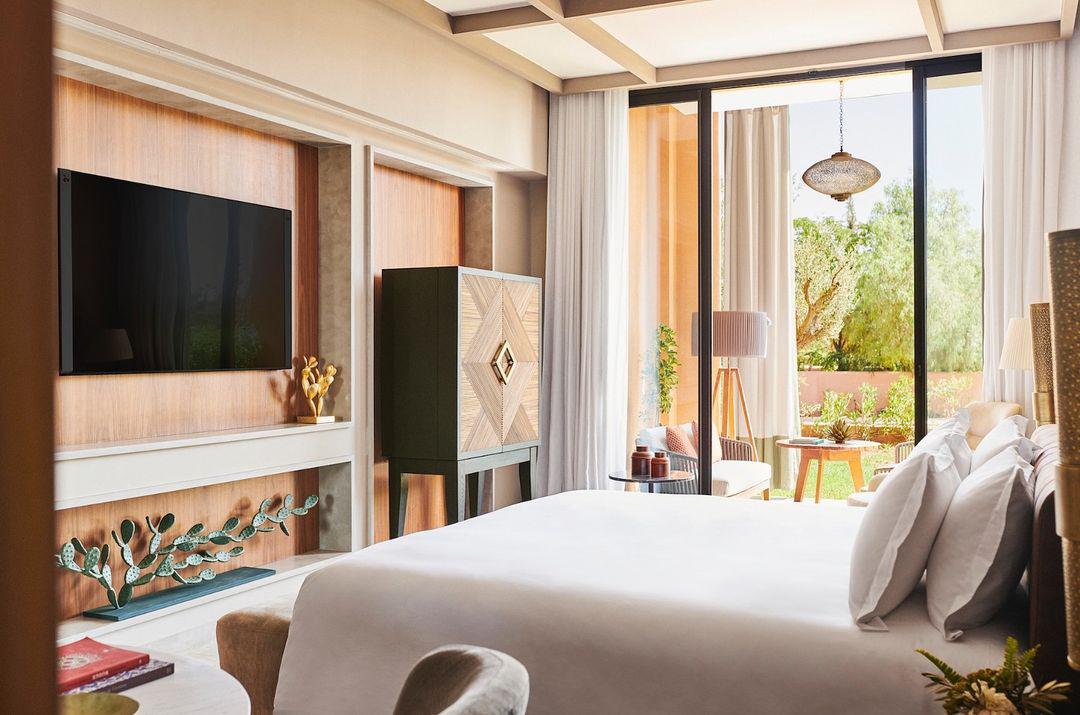Les 130 chambres, réparties dans 16 pavillons inspirés de l'architecture vernaculaire des douars marocains, rendent hommage à l'artisanat local. Chaque chambre dispose d'une terrasse ou d'un jardin semi-privatif. Les têtes de lit finement ouvragées reprennent la technique traditionnelle du tataoui, tandis que les tapis berbères et les poufs en cuir apportent une touche chaleureuse. Mention spéciale pour les salles de bains, ornées de mosaïques sur mesure, avec des douches ouvertes sur un patio privé.