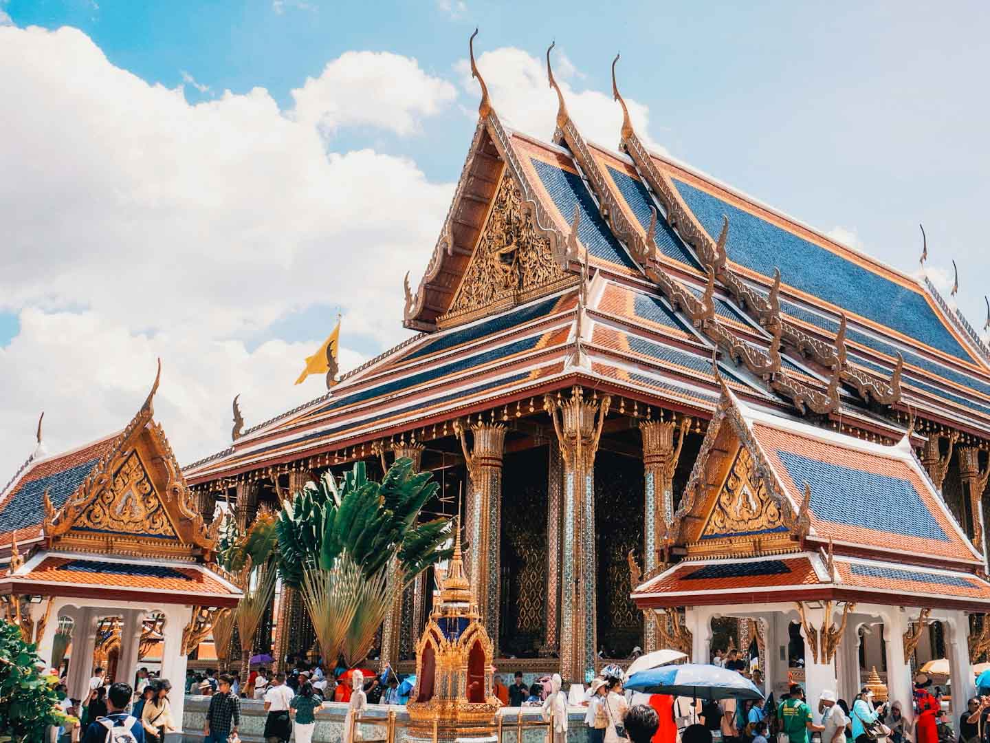 Construit en 1782, le Grand Palais de Bangkok comprend plusieurs bâtiments magnifiques, dont le Wat Phra Kaeo - le temple du Bouddha d'émeraude - qui contient un magnifique Bouddha en jadéite datant du XIVe siècle. Trois fois par an, le roi en personne ou un membre de la famille royale, change la tenue du Bouddha par différents vêtements en or incrustés de pierres précieuses. On traverse ensuite le fleuve avec un petit bateau, pour visiter le Wat Arun ou Temple de l'aube, situé sur la rive droite du Chao Phraya. Il apparaît comme une véritable montagne de 70 mètres de hauteur sertie d’or, nommée le prang, entourée de quatre tours satellites que l’on aime contempler dans les reflets de l'eau.
