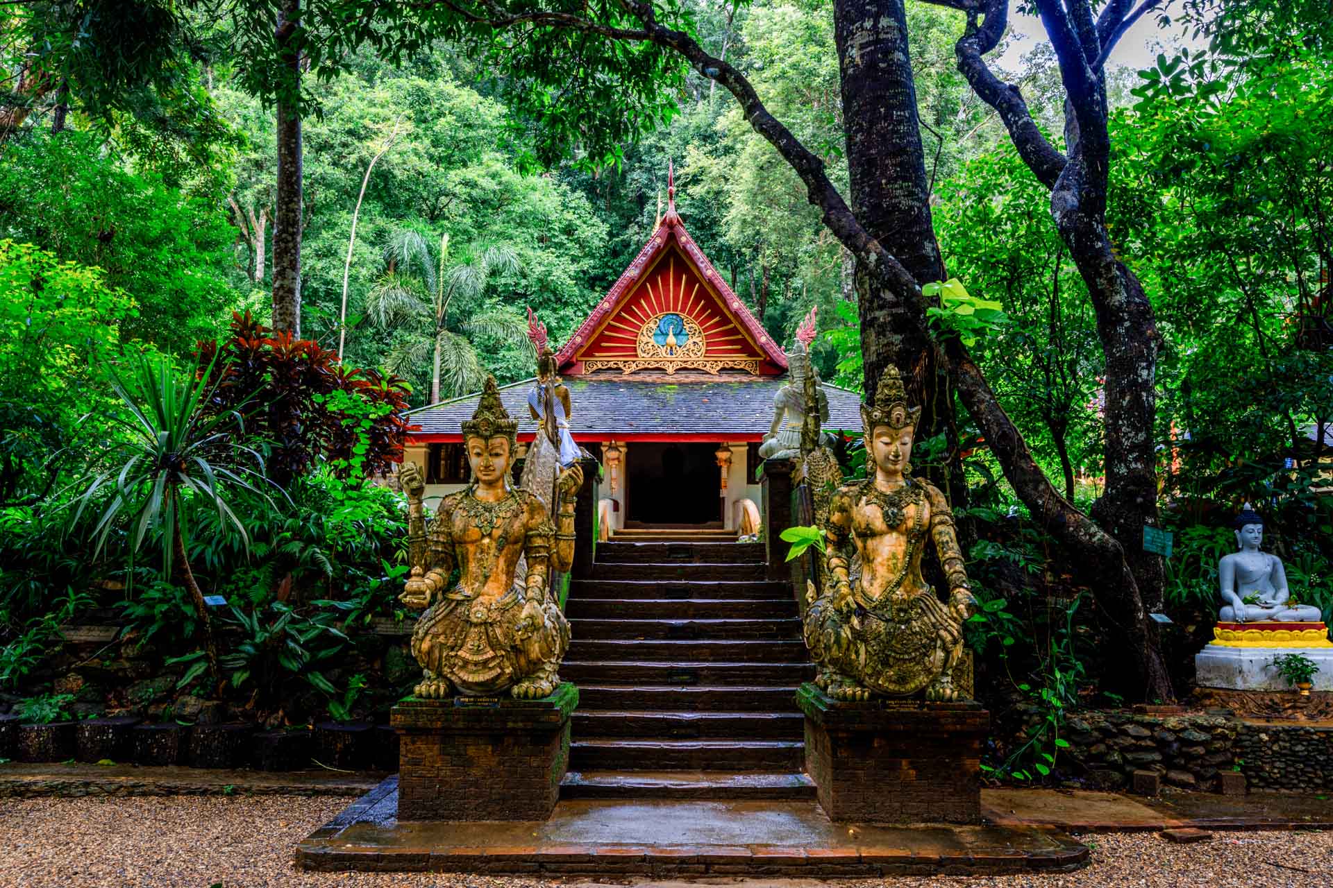 Nous partons ensuite à l'extérieur de la ville pour découvrir le plus connu des temples de Chiang Mai, le magnifique Doi Suthep, situé dans la montagne à 1 200 m d'altitude. Pour se rendre au sanctuaire il est recommandé de réserver un taxi collectif nommé songthaew, ces pick-up rouges abondent dans les rues. Il est impossible de résister au charme de ce monastère qui tient aux caractéristiques de l’art Lanna avec ses structures pointant vers le ciel nommées chedis, ses statues et ses toitures typiques. A l’intérieur du temple on trouve de superbes fresques murales au léger style hindou qui retracent la vie de Bouddha. Après la visite, on peut même se livrer à une séance de méditation dans un centre dédié à cette discipline.