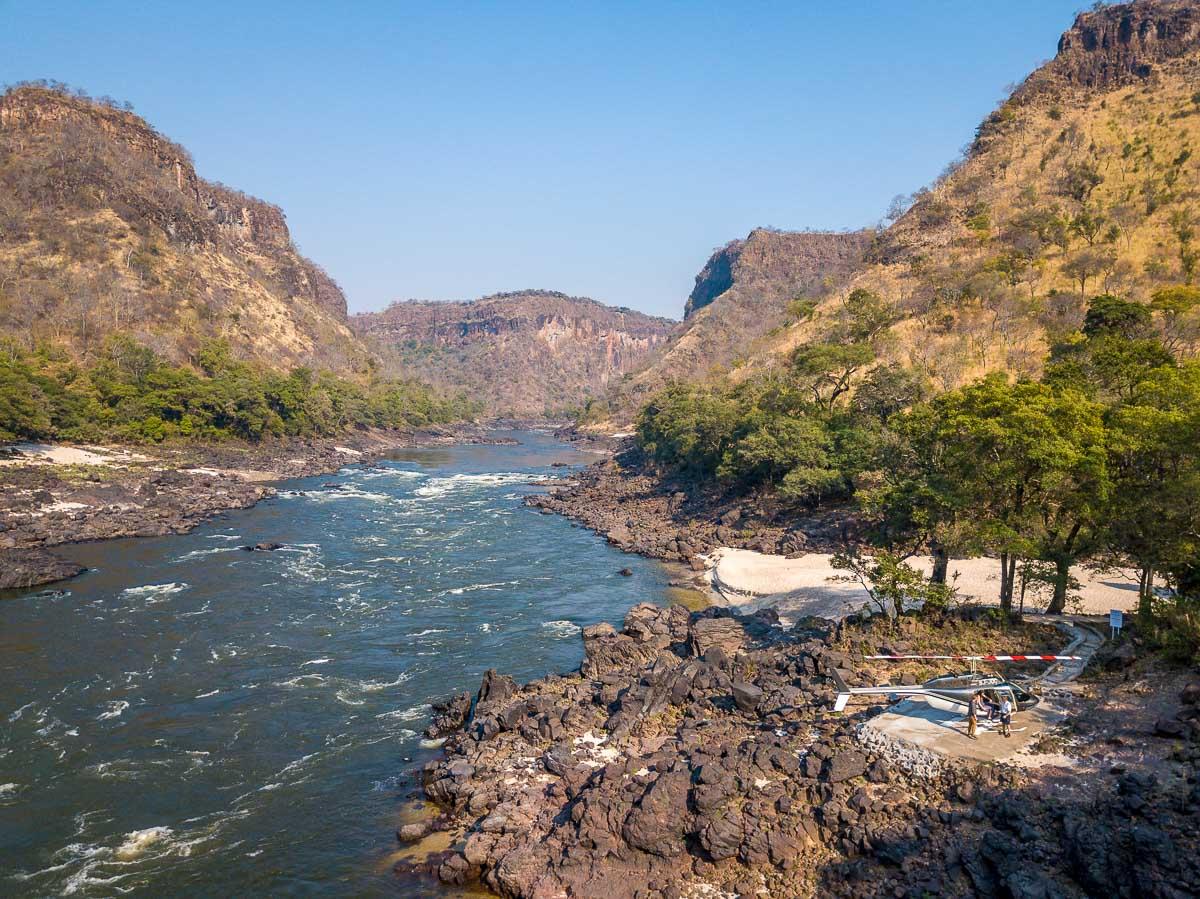 La voiturette vous cueille à l’entrée du lobby pour vous amener en quelques minutes, jusqu’à l’héliport de l’hôtel. On entend l’appareil avant de le voir, tournant gracieusement avant d’atterrir. Casque vissé sur la tête, ceinturé, on peut décoller pour la prochaine étape de notre itinéraire en Zambie. Au sol, la savane, rouge, piquetée d’arbres, un bout de forêt et ce plongeon, au cœur de la gorge de Batoka, plus de cent kilomètres de falaises tour à tour dans la nudité de leur basalte ou recouvertes de forêts de mopanes : au fond, les eaux glauques du Zambèze. L’appareil zigzague dans la faille avant de se poser délicatement. Bienvenue à Bobo Camp. La table du petit-déjeuner est dressée. Une coupe de champagne, une coupelle de fruits frais et ces petits sandwichs gourmands. En contrebas une improbable plage de sable fin. Des rochers aussi.