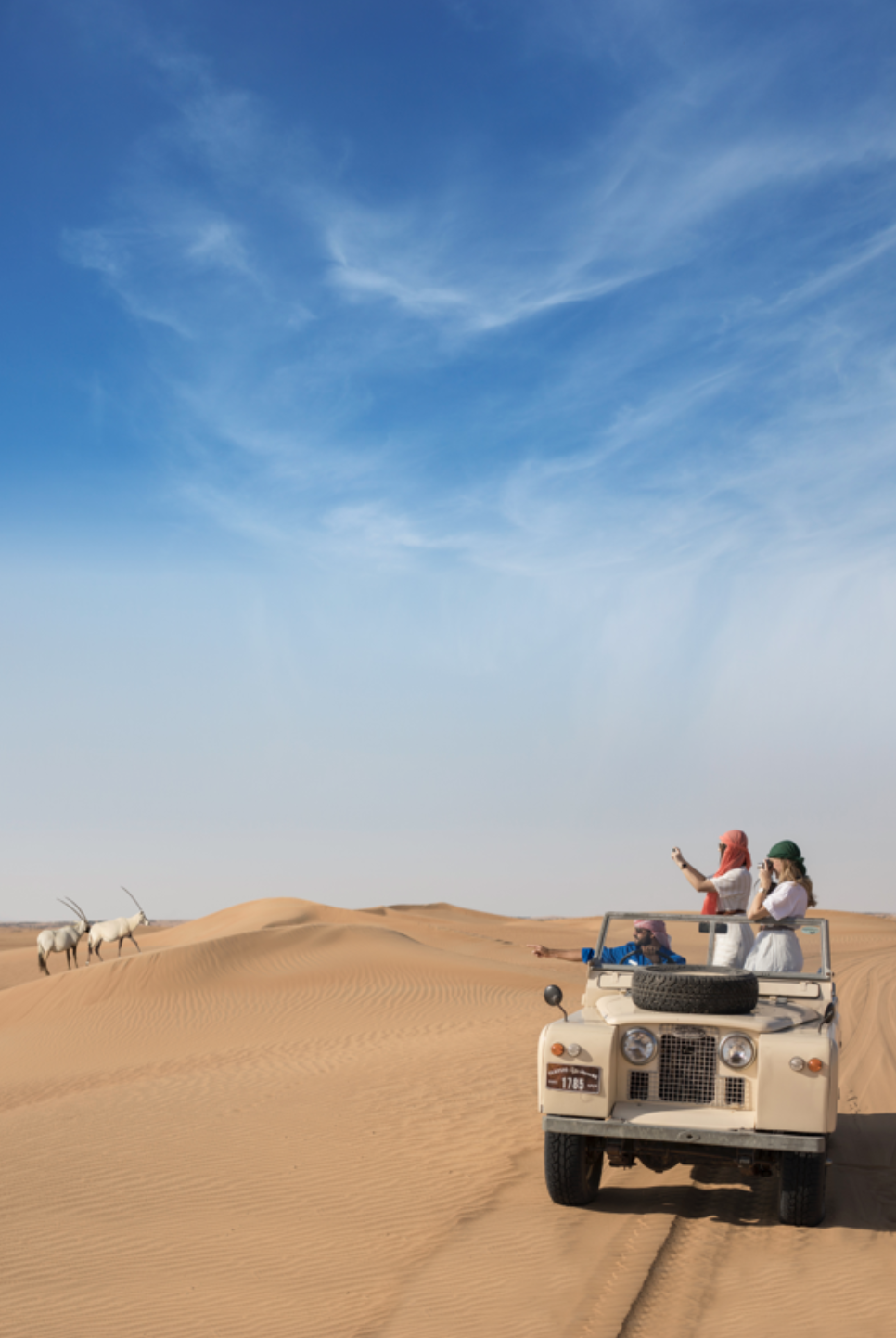 Il y a quelque chose de profondément cinématographique à traverser les dunes à bord d’une Land Rover des années 1950, ouvertes sur l’immensité, comme si le temps ralentissait soudain.