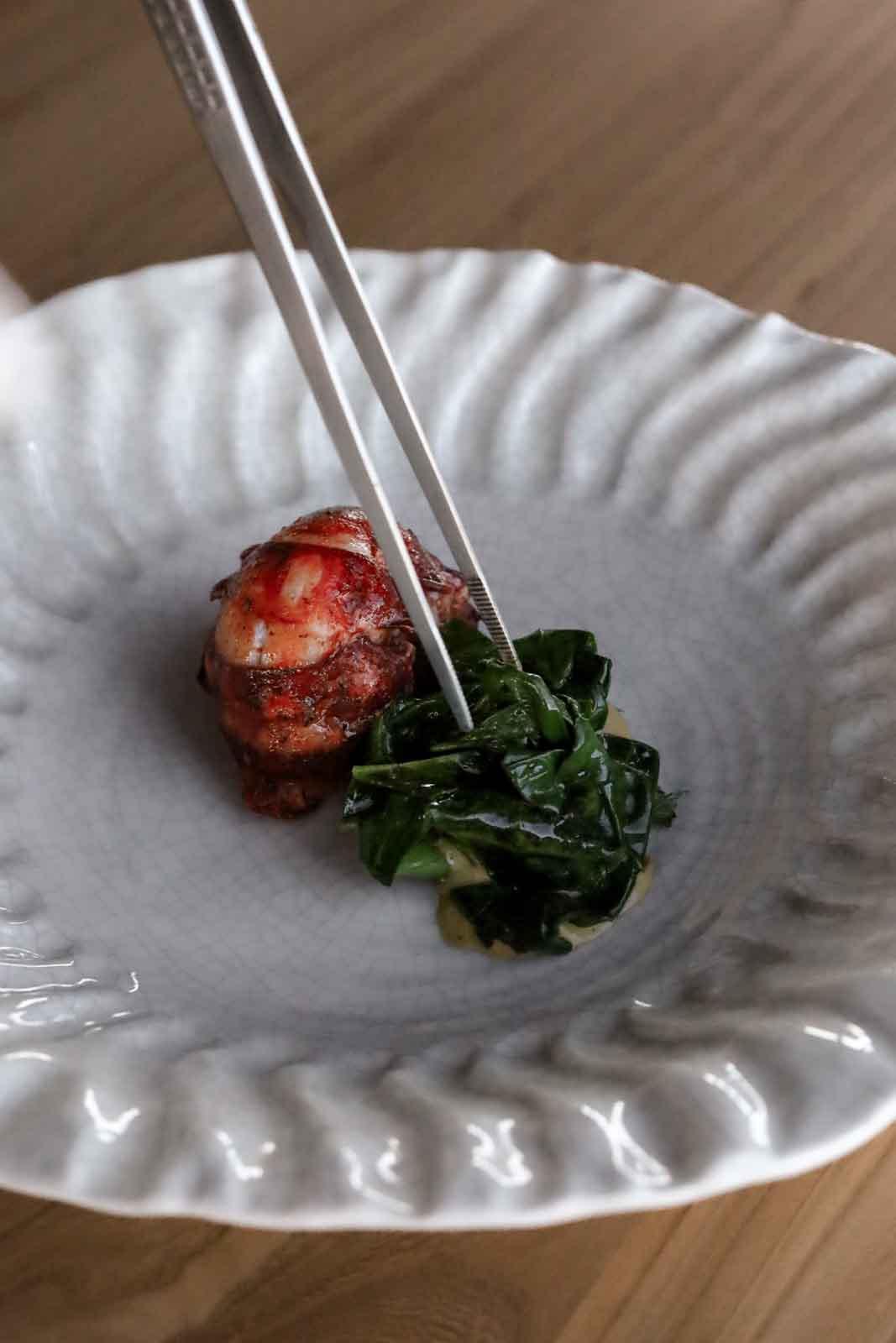 Découvrir la salle de restaurant, le soir venu est une belle émotion, une totale immersion aussi. On est immédiatement happé par le paysage, la nature tout autour. Et, comme l'on goûte d'abord avec les yeux, autant dire qu'on est dans les meilleures dispositions lorsque arrivent les amuses-bouche. Un trio plaisant où le shot de radis sort son épingle du jeu. Pour suivre, on se laisse agréablement surprendre par une huître en sorbet, qui met en plein dans l'iode et dans le mille. L'asperge, super puissante, un poil plus clivante, n'en est pas pour le moins intéressante. Les plats se suivent et on ressent alors le goût du chef pour le terre/mer, les jus corsés et les fleurs locales, qui décorent nombre d'assiettes. D'ailleurs, les arts de la table sont particulièrement bien travaillés. Le bar de ligne associé avec de la moelle de veau nous laisse baba. Et on avoue un vrai coup de cœur pour un petit plat de transition, qui a tout d'un grand si on le pousse encore un peu : le pré-dessert glacé au picodon, avec une eau d'olive noire.