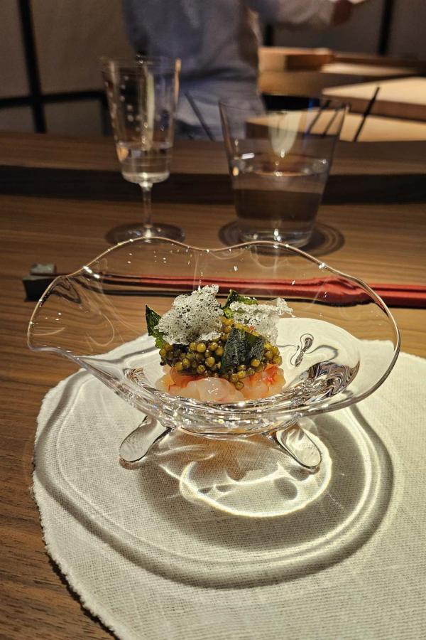 Bouillon iodé accompagné d'une confiture d'algues nori pour commencer. Pour suivre, une séquence composée de sashimis, parmi lesquels un trio de saba (jeune maquereau) au raifort, dans un consommé d’algues, réveillé par une gelée de tosazu (vinaigre de riz au dashi) ; puis des sashimis de toro, concombre, cresson et shiitake. Ou encore un formidable gambon.