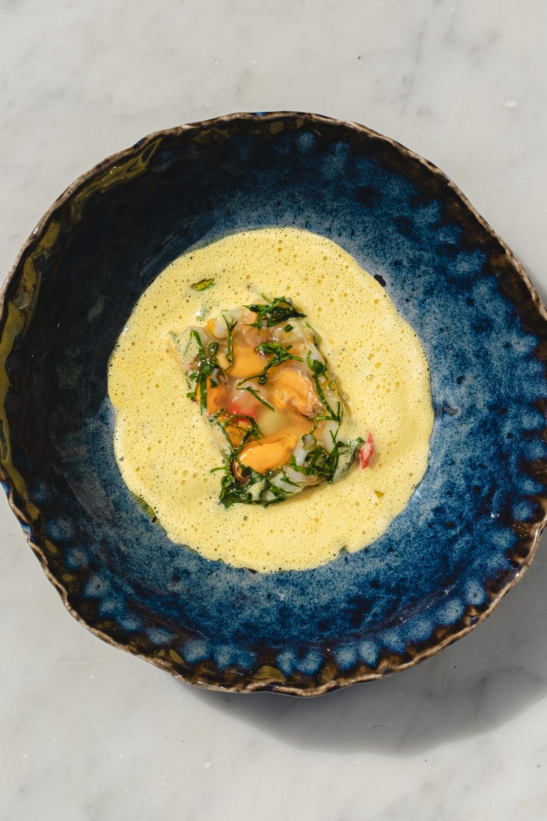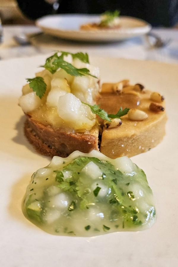 Deux amuse-bouche l'un façon préfou avec quelques légumes du potager, l'autre très fraîche autour de la carotte. On remarque tout de suite la vivacité et le soin apporté au dressage. À ce sujet, les céramiques sur-mesure de Carole Fraile sont splendides, poétiques et de véritables écrins pour les créations du chef.