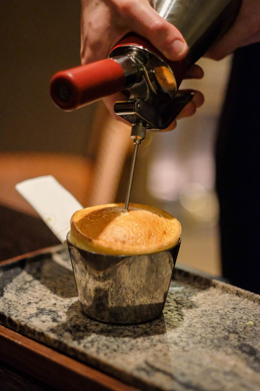 Palace, évidemment, avec une moyenne de 3 serveurs par table, tous tirés à 4 épingles, mais sans affectation. La jeune équipe, menée de main de maître par Valentin Langlois, laisse au contraire transparaître sa joie d'être là. La salle est particulièrement mise à l'honneur chez Nonos où, du service du déjà fameux « Soufflé » au plateau de fromages, en passant par le chariot de tranche, l'essentiel du spectacle se passe sous nos yeux, pour le plus grand bonheur des étrangers et des Parisiens qui en oublient d'être blasés.