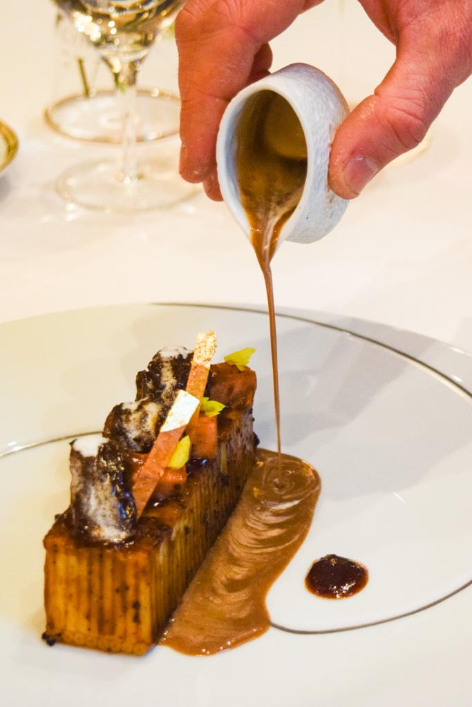 Difficile de ne pas faire le panégyrique de Christian Le Squer tant ce dernier livre une prestation magistrale au Cinq. En bon Breton, il rend un hommage permanent à ses terres natales, revisitant le kouign-amann (en apéritif), sublimant les langoustines (bretonnes, forcément), jouant avec le sarrasin, s’amusant avec le lait ribot de son enfance tout en n’oubliant pas les clins d’œil à la Ville Lumière comme en témoigne l’une de ces créations phares depuis son arrivée. Sa gratinée d’oignons à la parisienne revisitée avec élégance et technicité, arrosée d’un fabuleux Madère 1985 en harmonie parfaite, fait sensation. Il y a de quoi. Il faut faire éclater en bouche ces sphères parfaites, concentré éblouissant d'une gratinée traditionnelle, pour le croire.