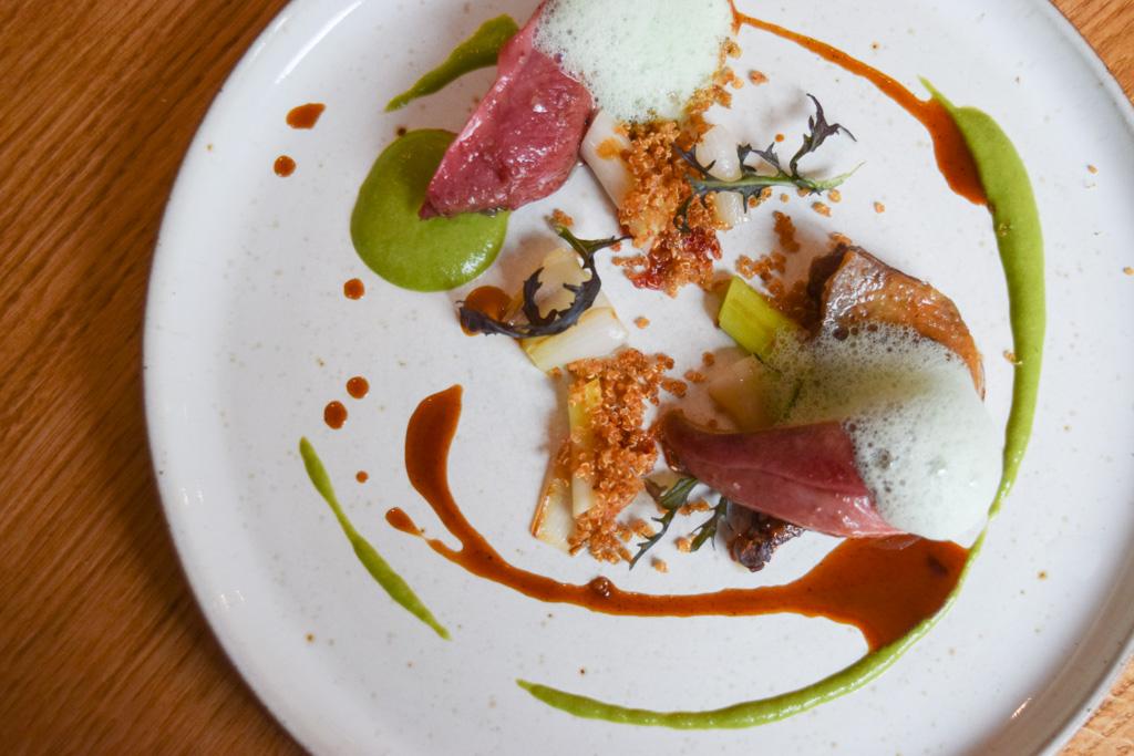 Arrive une composition sombre, surprenante, presque déconcertante : anguille fumée, mousse de sésame noir et dès de pomme Granny-Smith. Si l’on comprend la logique de faire une transition entre un plat de poisson coloré, gourmand et fruité et la viande qui doit suivre, on est un peu plus circonspect sur l’intérêt du plat en lui-même. Notre méconnaissance de ce produit rare qu’est l’anguille nous jouerait-elle des tours ?