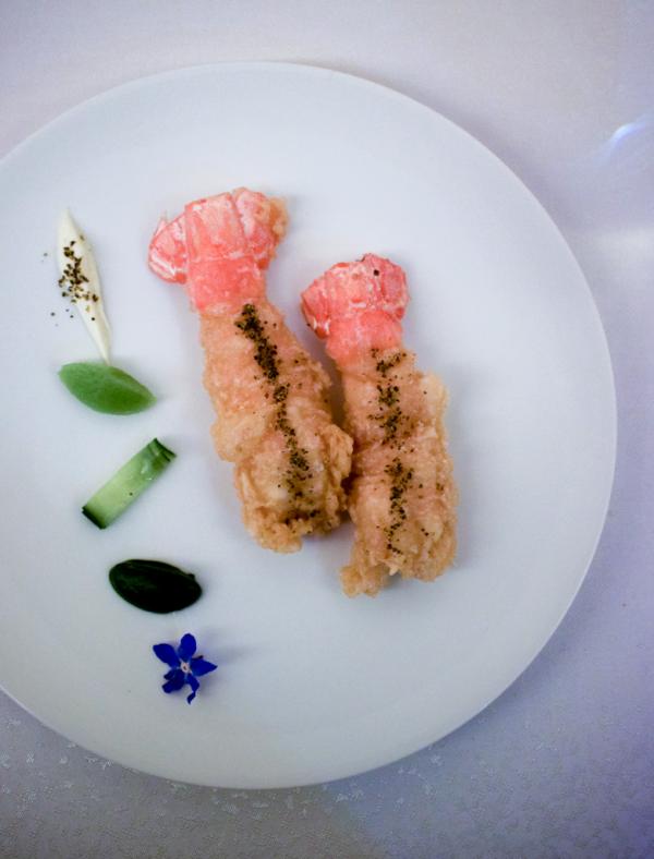 Au cours de notre déjeuner, cette philosophie de vie et cette vision de la cuisine se traduisent, non pas par de fantaisistes créations fumantes - ou fumeuses - comme le cliché de la gastronomie moléculaire le voudrait, mais par des assiettes souvent inclassables, aux harmonies malicieuses et à la précision millimétrée. Impossible de ne pas lire la double culture franco-japonaise, issue autant de son passage au Château Cordeillan-Bages que de ses séjours répétés à Tokyo dans ce pressé de foie gras et anguille fumée, judicieusement intitulé « Terre et Estuaire ». La langoustine, quant à elle, s’enrichit du goût puissant du sarrasin torréfié grâce à une cuisson façon tempura incroyablement subtile – un autre clin d’œil à la culture japonaise - en même temps qu'elle se rafraîchit à l'aide du concombre et à la menthe poivrée. Même topo pour ce surprenant risotto en trompe l’œil, l’un des plats signatures du chef, véritable alliance contre-nature, et pourtant drôlement efficace, de deux univers. La douceur du soja asiatique d’un côté, la puissance de l’huître et de la truffe de l’autre. L’onctuosité et le croquant. Le yin et le yang.