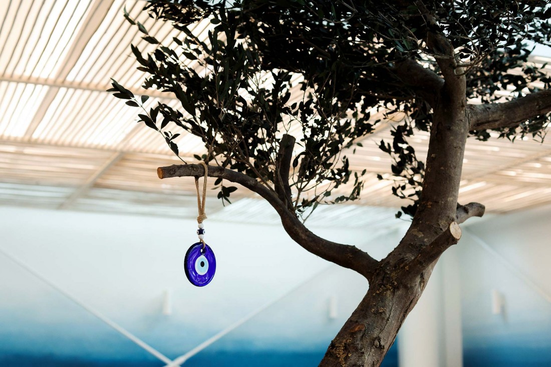 Véritable olivier au centre d'une table d'hôtes massive, mobilier sans chichis et murs bleus dégradés évoquant l’horizon méditerranéen, le décor est planté. La salle inspirée des terrasses des villages du Péloponnèse, pour peu que la lumière du soleil baigne les lieux, offre un voyage en Grèce à peu de frais. À l’étage, la mezzanine accueille la cuisine ouverte ainsi que la « Table de Yaya », table du chef à la sauce cool (à réserver spécifiquement à l'avance).