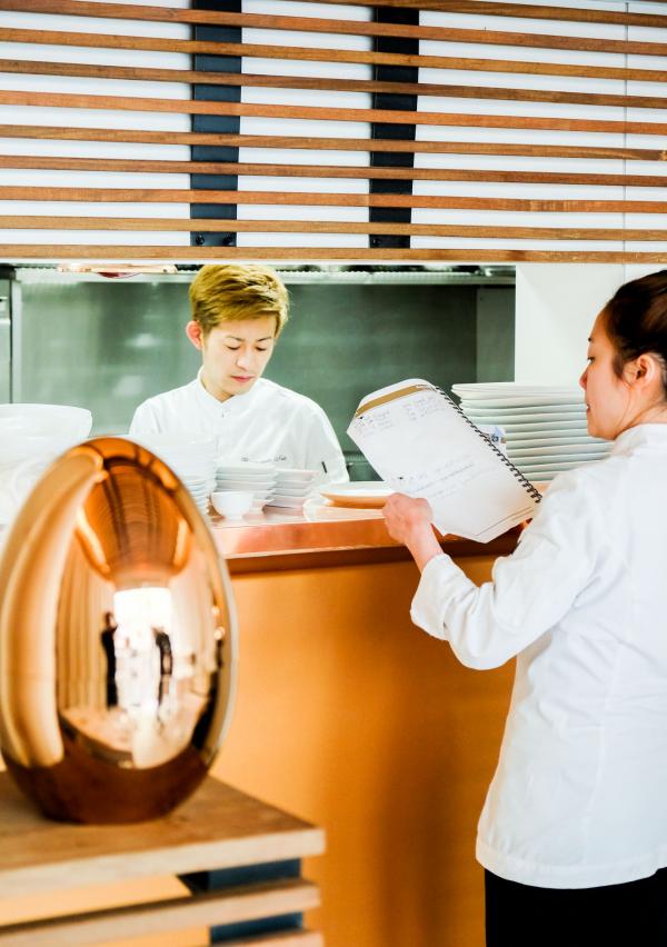 Avec ses vagues de bois ciselant le plafond et le fond du restaurant, son décor blanc immaculé et ses touches cuivrées – en harmonie parfaite avec les œufs Christofle en or rose – ou sa grande baie vitrée baignant la salle de lumière naturelle, Pertinence a été conçu comme un écrin aussi élégant qu’original. On notera que Ryunosuke Naito et Kwen Liew ont poussé le sens du détail jusqu’à l’installation d’une spectaculaire ouverture vitrée vers la cave, juste en dessous de la salle. Rares sont les restaurants de ce format (18 couverts) ayant atteint un tel niveau de raffinement.