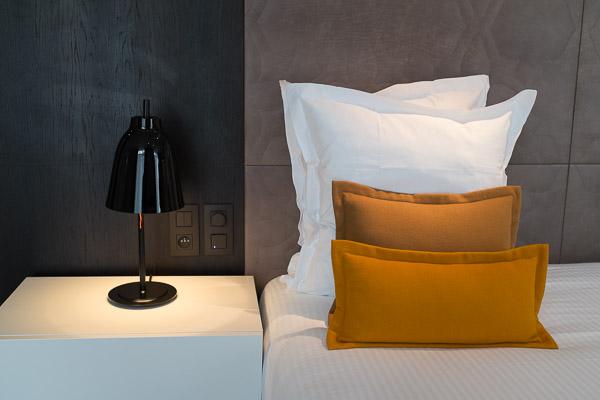 En dehors des 3 suites, les chambres se divisent en 2 catégories : les chambres Standards qui donnent sur la cour, et les chambres Deluxe, légèrement plus spacieuses, mieux équipées, surplombant la rue. Pas de déception en découvrant notre chambre : on retrouve le même sens du détail que dans les parties communes. Côté décoration, ce sont avant tout des teintes neutres - gris, blanc, brun - qui dominent mais bien sûr avec quelques touches colorées. Si l'on retrouve le rouge vif de l’entrée sur la console, les autres couleurs se font plus paisibles, comme les belles nuances de bleu déclinées sur coussins et couverture. C’est clairement une atmosphère de sérénité et de repos qui se dégage de la chambre, avec juste assez de couleurs pour y insuffler le même esprit enjoué caractérisant l’ensemble de l’hôtel.