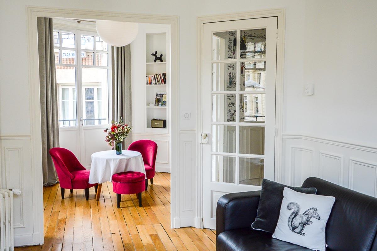 Une maison d’hôtes en plein centre historique de Reims, aménagée dans un immeuble d’inspiration Art Déco, ça vous tente ? . Entièrement rénovés, les deux appartements, Les Parisiennes (5*) et Le Loft (4*) respectivement nichés aus 2e et 3e étage, distillent le charme classique avec le triptyque parquet, cheminées et radiateurs en fonte. La luminosité des pièces traversantes fait vibrer les papiers peints et mobiliers dans un camaïeu de gris, beige et blanc. Chaque appartement auquel on accède par un escalier d’époque, dispose d’une cuisine équipée, d’un lit king size, d’un balcon et d’une vue imprenable sur la façade nord de la cathédrale de Reims.