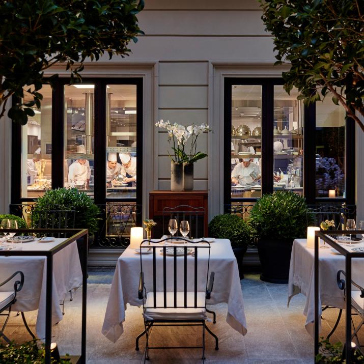 Les cuisines de Seta sont visibles depuis la cour intérieure qui accueille les tables du restaurant en été. © Mandarin Oriental