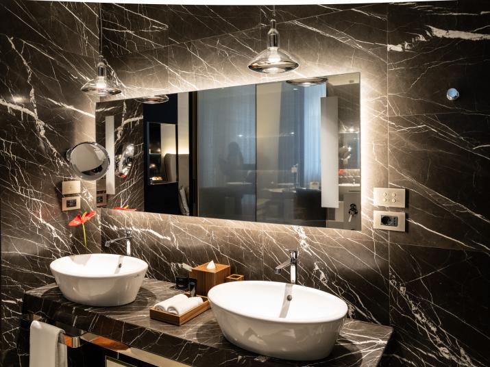 Une salle de bain en marbre résolument contemporaine, ici dans une Deluxe Junior Suite. © DB / Yonder