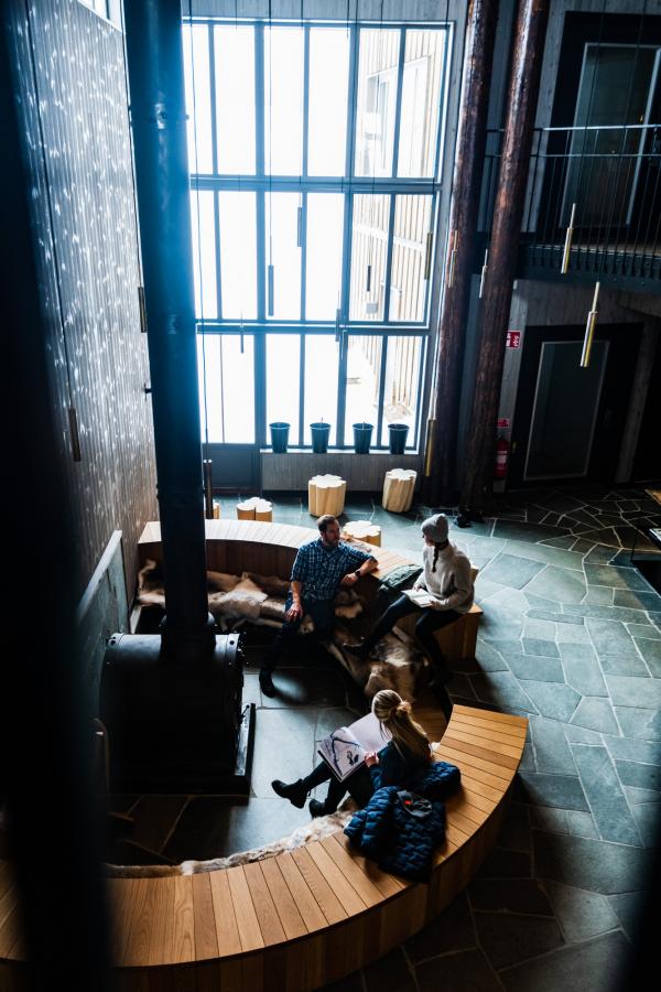 Niehku est directement associé à cette histoire puisqu’il occupe le site, classé monument historique, d’un ancien atelier de maintenance ferroviaire où les locomotives pouvaient être retournées sur place : c’est ce qui explique la forme semi-circulaire de l’édifice. Abandonné après l’électrification de la ligne, il n’en subsiste plus que les fondations, ainsi qu’un mur en pierre dont un pan a été ingénieusement intégré au bâtiment moderne par les architectes Krook & Tjäder. Le design intérieur a quant à lui été conçu par le studio Sylt et récompensé par le prix Versailles de l’Unesco.