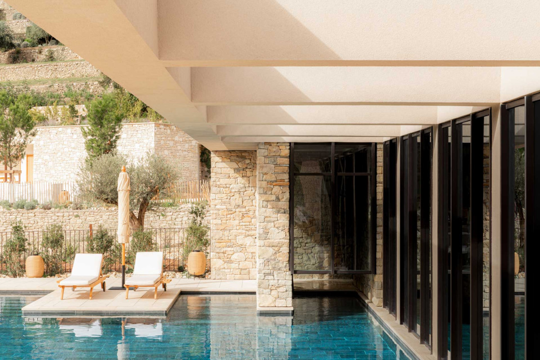 Pour ceux qui aiment allier cure de bien-être et visites des alentours, le Mas des Herbes Blanches est une option idéale. Située à l’épicentre de magnifiques petits villages de Provence — Gordes, Lacoste, Ménerbes — cette bâtisse de pierres typiquement provençale à la décoration sobre abrite également un spa Sothys mettant l’accent sur la minéralité et les jeux de lumière : mur de pierres sèches, large bassin se reflétant dans les miroirs du plafond…