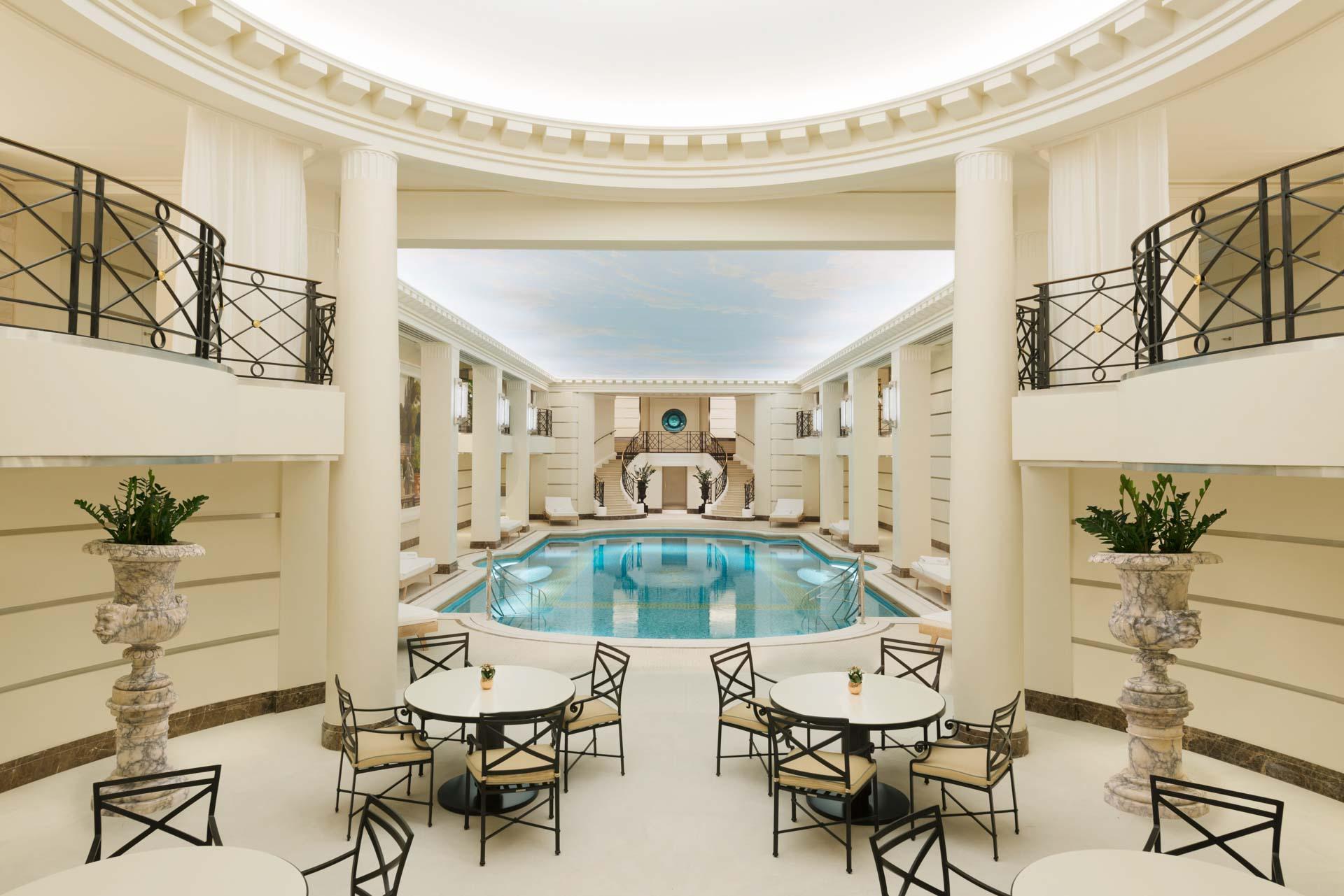 Dans cet univers aux teintes immaculées, la piscine XXL (16 m de long) peut accentuer la quiétude du corps et de l’esprit. Sous un ciel en trompe-l’œil, le bassin, tapissé de 600 000 carreaux de mosaïque, auréolé de colonnades et de fresques inspirées de la Rome Antique, se prête à quelques brasses, bercé par de la musique subaquatique. À proximité, le Floral Bar et sa carte healthy, qui mise sur les bienfaits des plantes et des fleurs, s’inscrit dans la philosophie holistique de la maison.