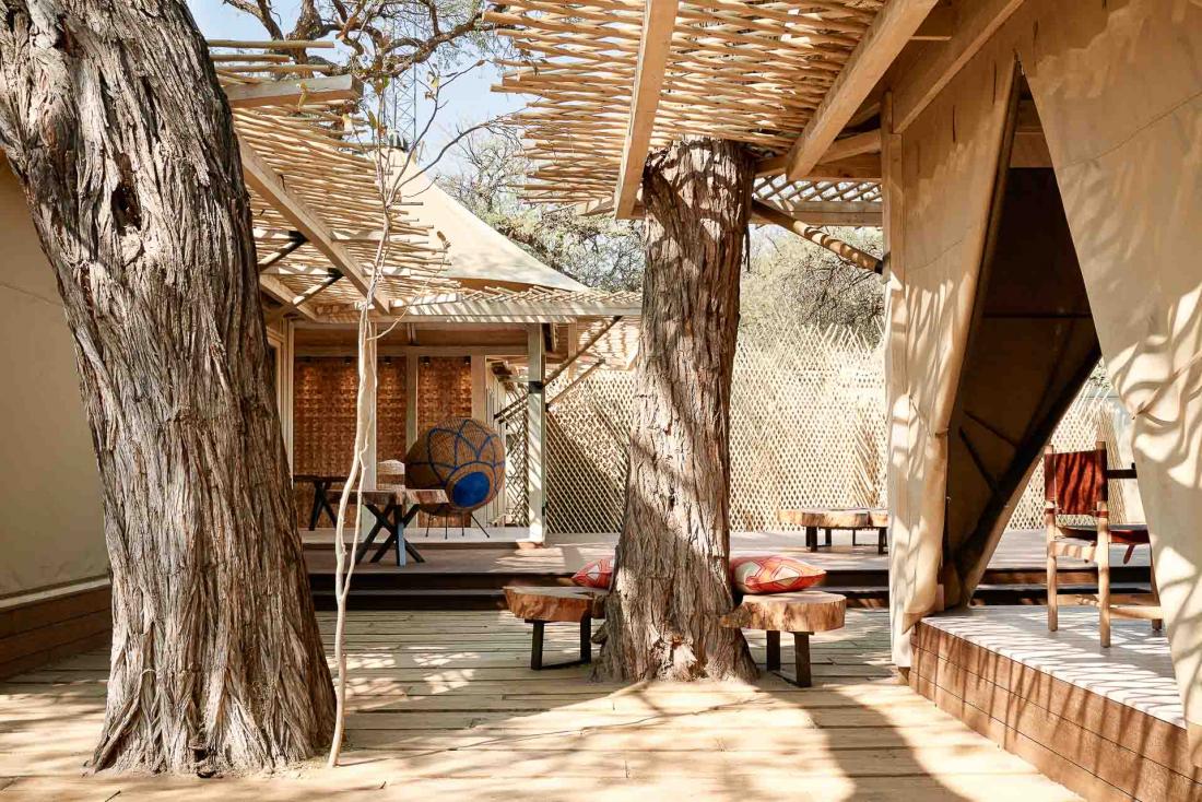 Dotées d’un lit à baldaquin, d’un bureau et d’une élégante salle de bain, les chambres arborent des couleurs éclatantes, contrastant avec la savane