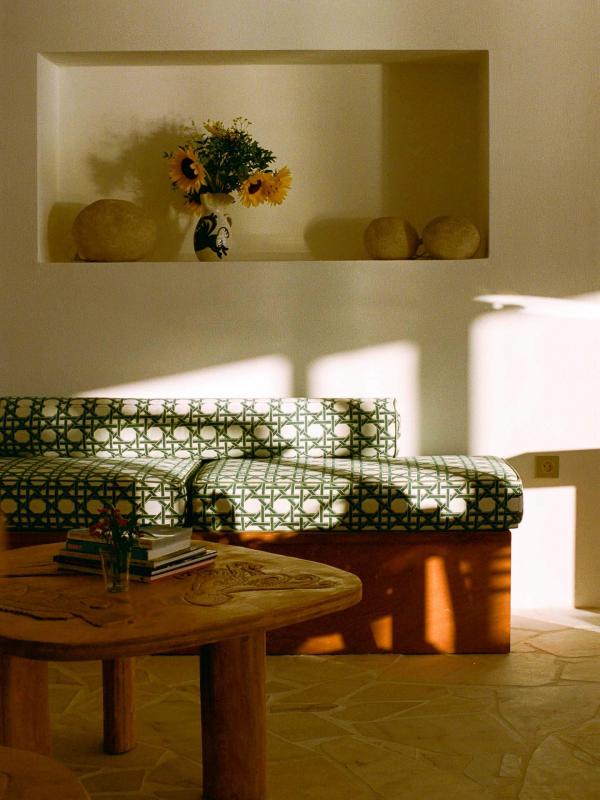 Dans les 5 chambres, déco minimaliste avec jonc de mer au sol, draps blancs, lampes en cordages, têtes de lit en contreplaqué