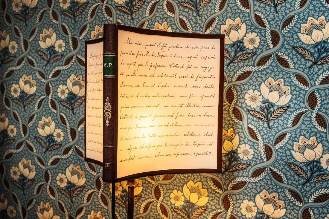 Dans chaque chambre, des abat-jours ont été réalisés sur mesure avec des extraits de La Recherche