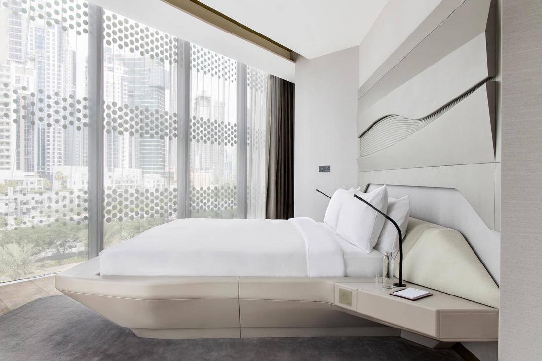 - L’atrium, aux allures de vaisseau spatial, tout en balcons et en lignes sinueuses, dessert les 74 chambres et 19 suites de l’hôtel, aux différents jeux de couleurs : « Minuit » en référence à la vie nocturne bouillonnante et au ciel de Dubaï, ou « Désert », clin d’œil aux premières dunes à quelques kilomètres. L'hôtel 5-étoiles compte également un spa de 650 m2 avec piscine en plein air, et s’engage conformément à la Vision 2021 des Émirats arabes unis à réduire son empreinte carbone ou à ne pas utiliser de plastique.