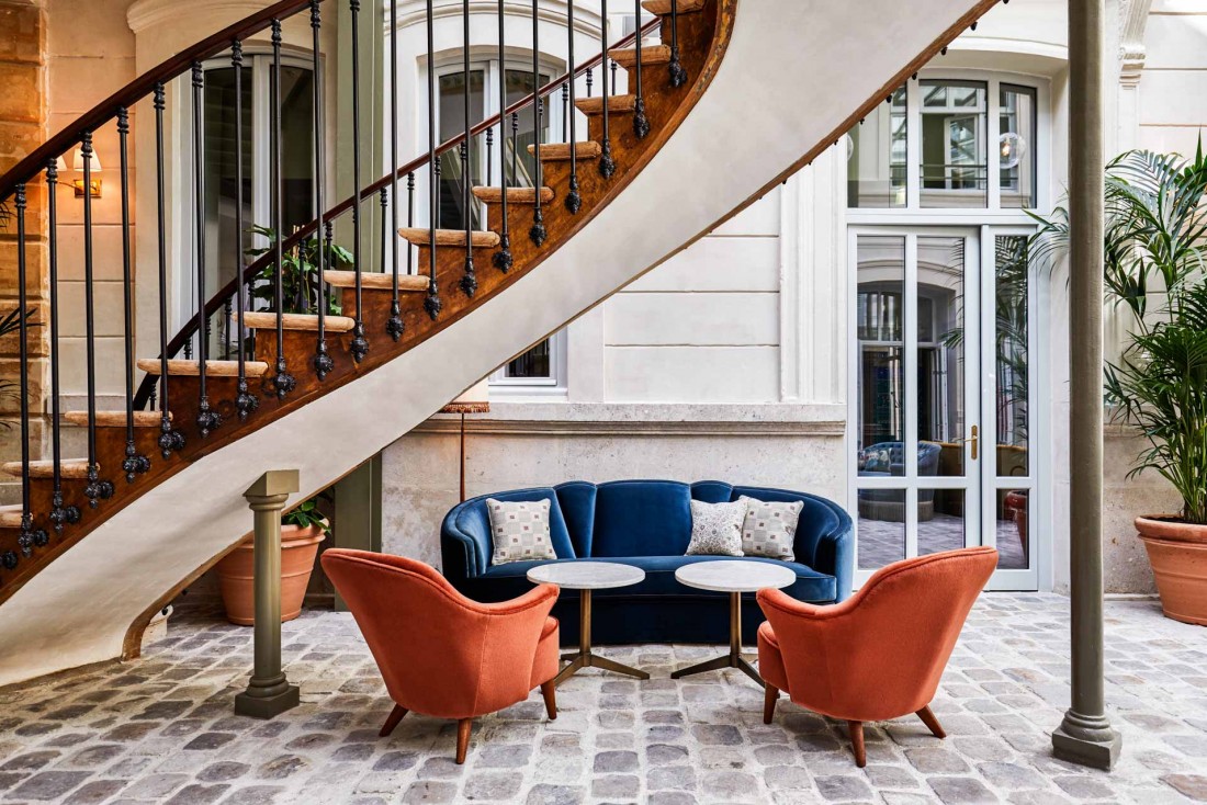 Il est 19 heures passées lorsque nous passons la majestueuse porte cochère du 30-32 rue du Sentier. À notre gauche, un magnifique escalier en spirale du XVIIIème siècle. Juste en dessous, des sofas aussi colorés qu’accueillants, un espace pour boire le café, puis, en avançant, on découvre de vastes terrasses, un réseau de cours intérieures, un Jardin d’Hiver avec mur végétal… mais pas de trace d’une réception ! Celle-ci ne se révèle finalement que dans un coin discret, à l'abri du passage. « L’idée est que l’on ne se sente pas dans un hôtel ! » explique malicieusement Sharan Pasricha, CEO et fondateur d’Ennismore, la société à la tête des établissements Hoxton. C’est réussi.