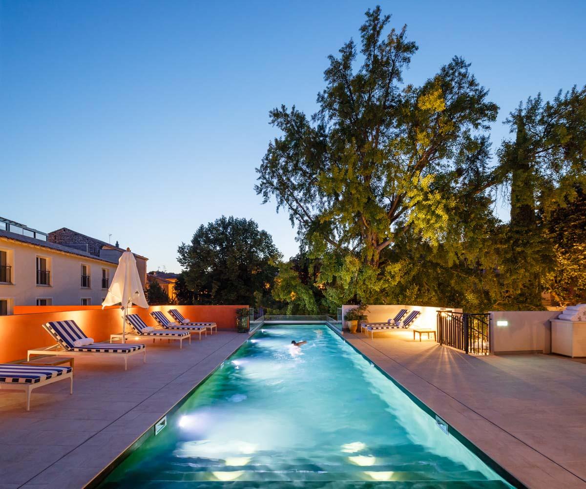 L’hôtel : idéalement situé face à la tour de Constance et l’entrée du musée des remparts, ce boutique-hôtel du Gard sis dans une ancienne caserne du XVIIIe siècle propose 14 chambres élégantes. Hauts plafonds, murs en pierre et parquets anciens dialoguent avec un mobilier contemporain et des équipements modernes. Il règne dans cet écrin 5 étoiles un esprit familial. Et pour cause : les propriétaires Cécile et Stéphane Rives, hôteliers indépendants, habitent les lieux avec leurs cinq enfants. Un espace lounge agréable, un spa avec piscine intérieure et des prestations rares comme un petit-déjeuner servi de 7h30 à 15 h complètent le tableau.