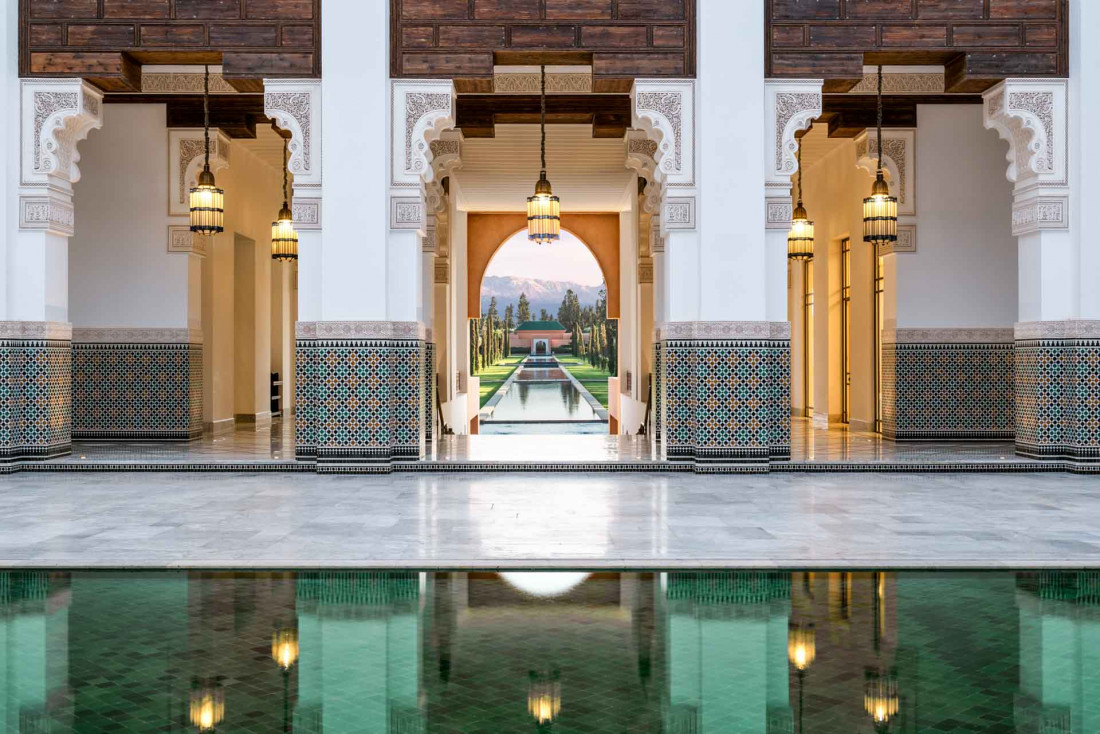 À la lisière de la Palmeraie, Amanjena se déploie comme un rêve architectural signé Ed Tuttle, inspiré des jardins de l’Alhambra et des bassins de la Ménara. Ici, l’espace respire : colonnades monumentales, arcades silencieuses, eau verte qui miroite au centre du domaine comme un cœur immobile. Après vingt-cinq ans d’existence, la propriété vient d’être repensée en profondeur, artisans et maîtres d’art redonnant vie aux stucs et au tadelakt rose, aux zelliges posés à la main et aux jardins redessinés pour durer. L’atmosphère demeure fidèle à l’esprit Aman : sophistication discrète, calme souverain, lumière domptée.
