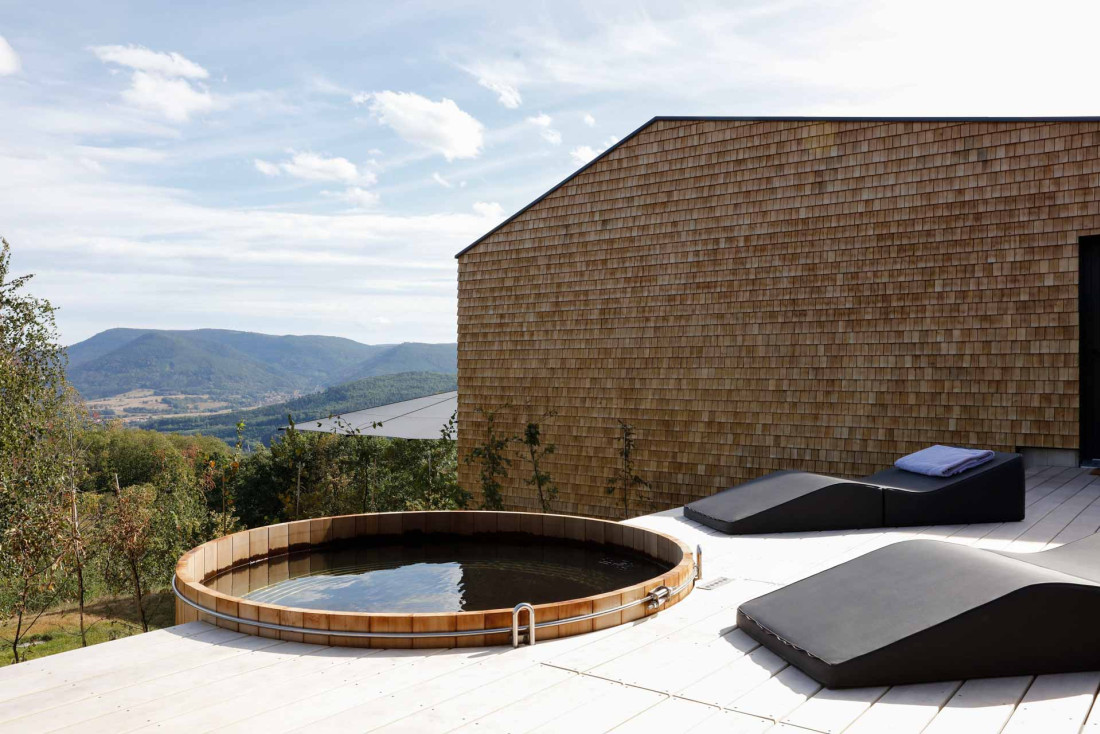 Perchés dans les hauteurs du versant alsacien des Vosges, le 48° Nord profile sa silhouettes de cabanes design en bois brut sur les pentes herbeuses. Installé au cœur d’une zone Natura 2000 protégée, certaines de ses hyttes sont équipées sur les balcon d’un bain nordique chauffé profitant d’une vue sur la nature. Idéal pour une escapade relaxante.