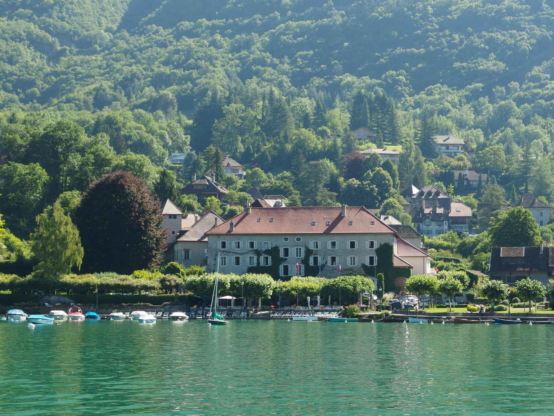 Corinne et François Debuquoy, les propriétaires, sont tombés amoureux de cet hôtel où ils ont passé leurs vacances pendant près de 30 ans. Racheté en 2015, ils l’ont entièrement rénové dans un style moderne avec du bois clair, des tissus bleu lac et des objets chinés qui apportent un supplément d’âme aux 32 chambres et suites des deux bâtisses. Face à la plage privée et au parc où trône l’été venu une grande tente saharienne, le restaurant offre une vue sur la baie de Talloires, tandis qu’un bar et un salon de thé complète l’offre de restauration. Depuis juin 2021, l'hôtel compte également un spa avec piscine intérieure, sauna, hammam et jacuzzi.