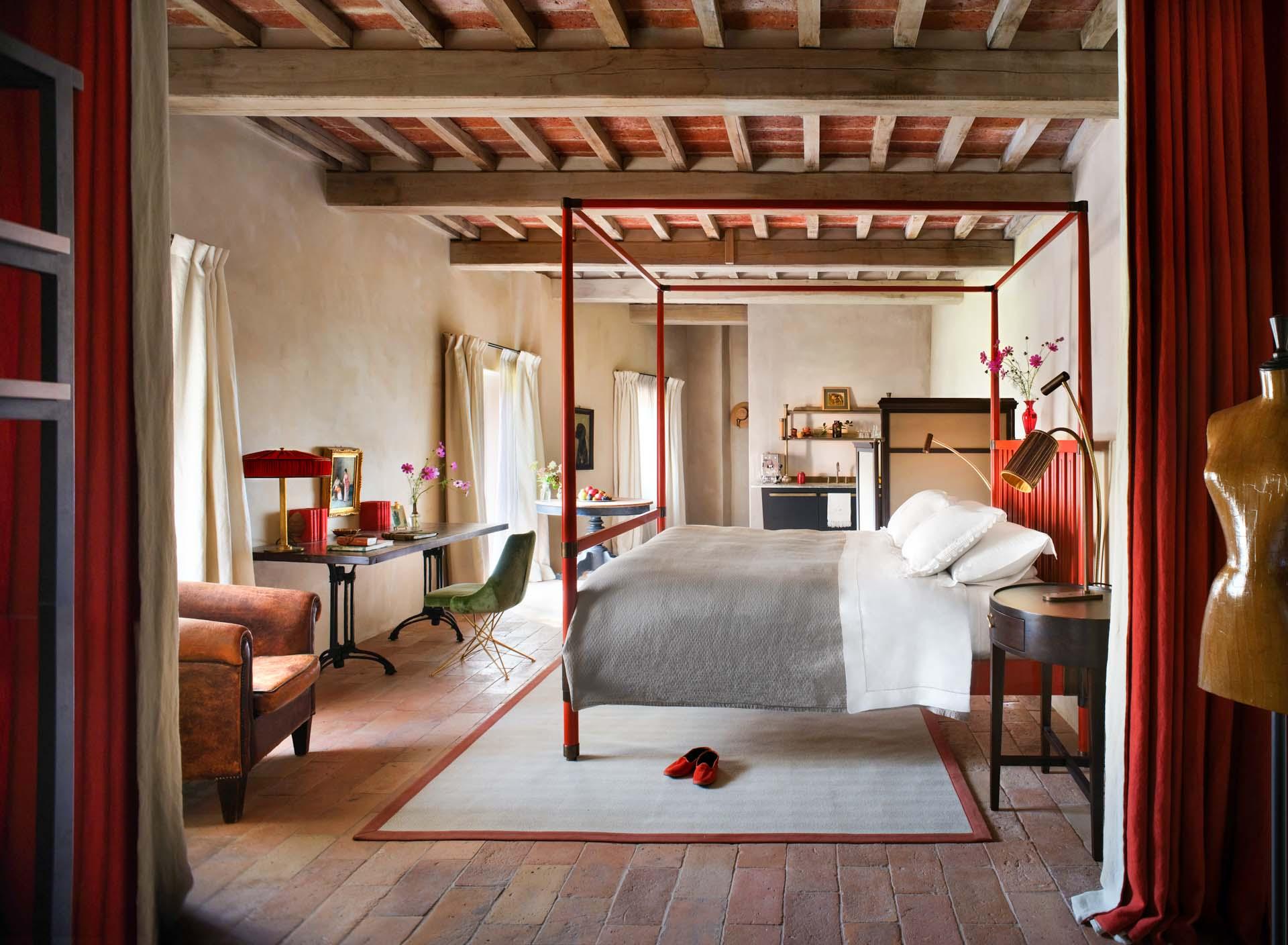 Les chambres ? Au cœur des bâtiments, une collection de 22 chambres et suites se dévoile, préservant avec soin les structures d'origine. Les pièces généreuses, allant de 35 à 120 m2, et les plafonds hauts dessinent les contours d'un luxe incomparable : celui de l'espace offert sans restriction. Malgré une quête de simplicité, la richesse des matériaux n'est, en aucun cas, sacrifiée. Une sélection de meubles au design raffiné met en lumière les assises de la maison italienne Gervasoni et les fresques rénovées que l’on devine sur les murs. On aime les chambres qui s’ouvrent sur le jardin et le bassin où il n’est pas rare de voir un animal curieux pointer le bout de son museau.