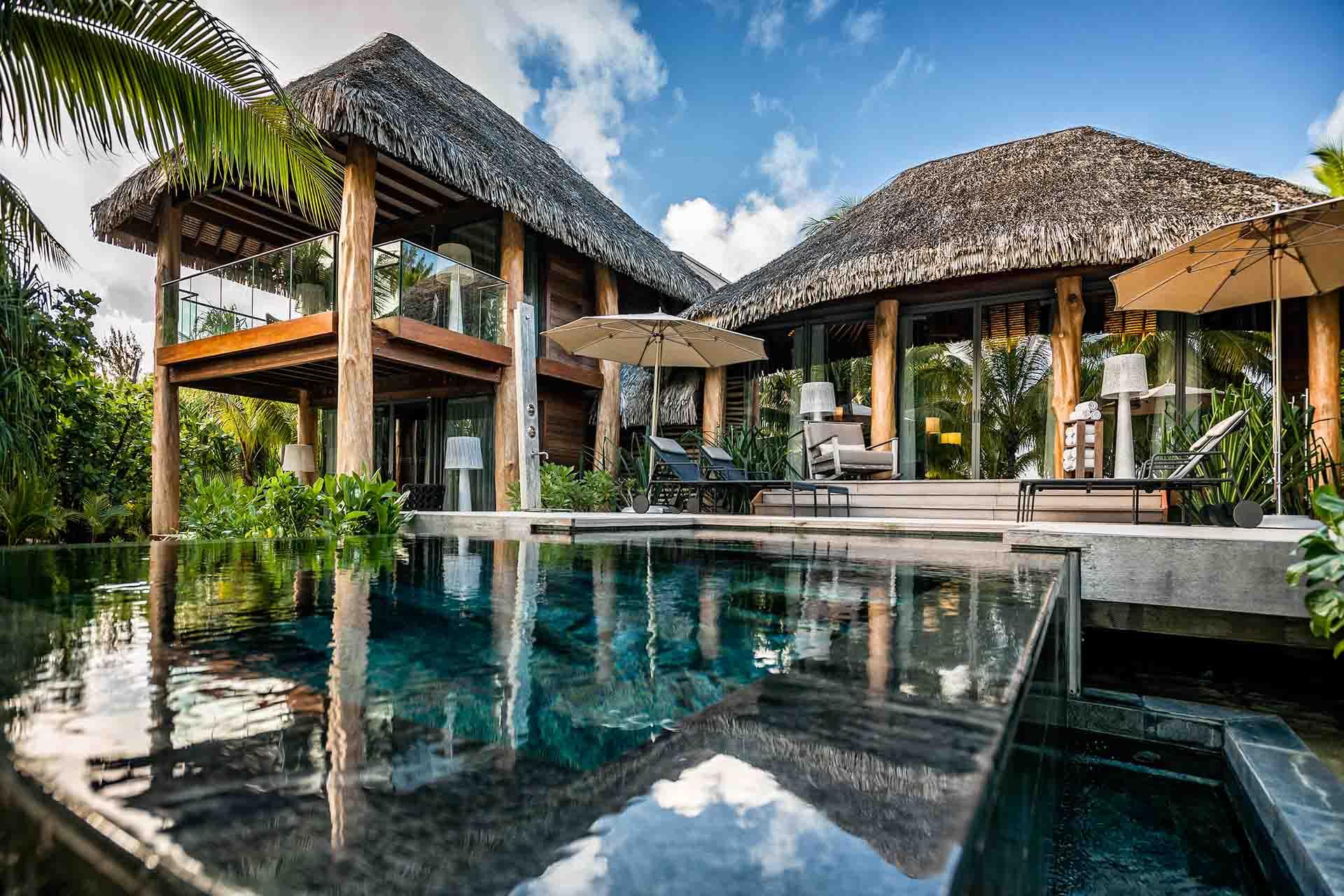 Ce qui fait la différence ? L’île-hôtel propose 35 villas privées d’une à trois chambres donnant sur West Turtle Beach ou South Mermaid Bay. Elles ont comme points communs l’espace et les références à l’esprit et aux traditions de Polynésie. Les murs en bois et les toits recouverts de feuilles de pandanus s’inspirent des fare en bambou. Les grandes baies, dans toutes les pièces, permettent de profiter des vues sur le jardin luxuriant planté de cocotiers et de miki miki et la piscine privée.