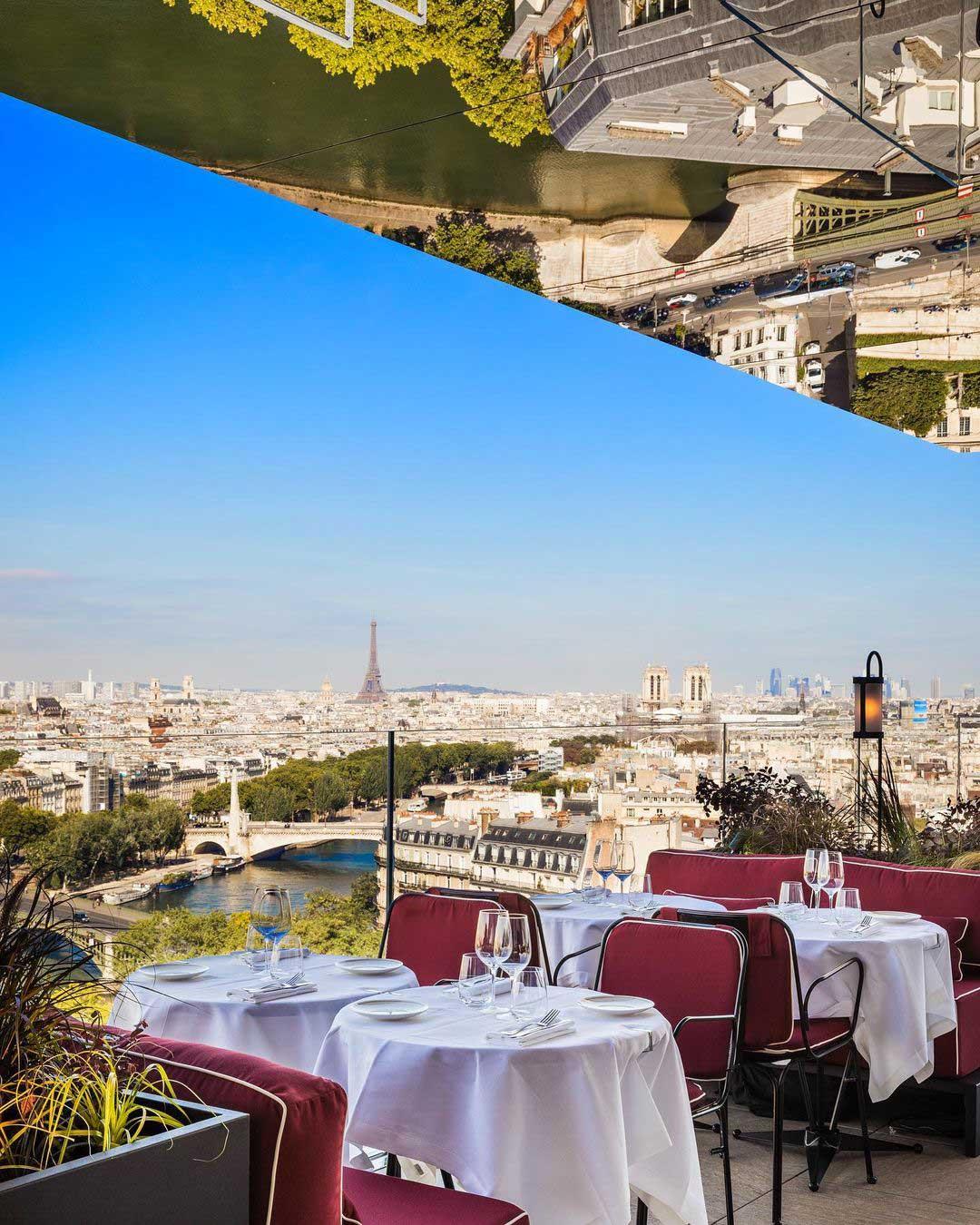 Le cadre ? Spot haut perché de la capitale, SO/Paris s’est amarré sur les quais de Seine en investissant - du 7e au 16e - les étages d’un immeuble des années 60, haut de plus de 50 m, dont le lifting a été réalisé chirurgicalement par l'architecte britannique David Chipperfield. Dimensions vertigineuses et vue unique sur la capitale, l’hôtel avec rooftop offre également l’un des meilleurs déjeuners d’hôtel de Paris, au sein de son restaurant Bonnie, également bar et club, qui se déploie aux 15e et 16e étages. On découvre une ambiance chaleureuse d’ex fan des sixties, décor d’exception imaginé par Jordane Arrivetz de l’agence Notoire, dont les immenses baies vitrées offrent un panorama unique où voir Paris, mais aussi où être vu. Brasserie chic à l’inspiration new-yorkaise, l’adresse joue la carte de la nostalgie vintage mais aussi de l’univers futuriste, avec notamment les œuvres miroirs d’Olafur Eliasson qui donne à voir la Seine à l’envers.