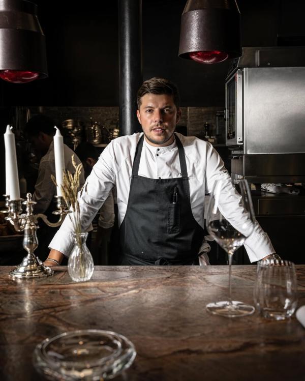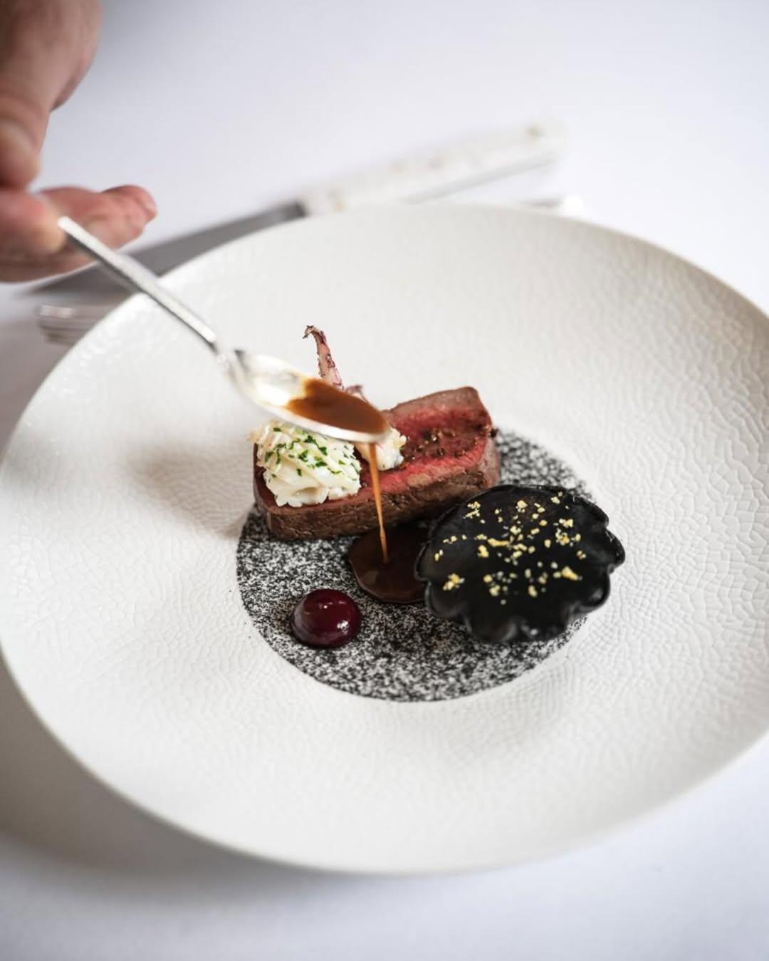 Après un apprentissage auprès des très grands, de Philippe Legendre version 3 étoiles à la table du Georges V, à Christophe Pelé période Royal Monceau, il a développé un style de cuisine et une patte bien à lui. D’autres exemples ? Ce « surf and turf » revisité, version étoilée du plat américain emblématique convoquant bœuf et homard, s’avère un monument de lèche-babines. Ou encore ce râble de lapin et poulpe escorté d’une fine tartelette à l’encre de seiche, expression d’un terre-mer abouti. En saison, le chef célèbre les gibiers (« Dos de biche aux baies de Manakara »…) au point d’avoir créé et d’animer chaque année le Championnat du Monde du Lièvre à la Royale, en Sologne.