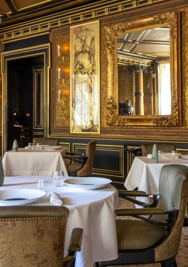 En plus du menu déjeuner, deux menus, Virée et Périple, invitent à une exploration sensorielle. Virée met à l’honneur la Bretagne natale du chef, avec des plats comme l’ormeau au caviar Kristal ou le maquereau sur son galet, escorté d’une écume de salicorne. Périple s’inspire de ses voyages et révèle des assiettes aux influences nippones et méditerranéennes, comme un Saint-Pierre grillé relevé d’un dashi fumé au katsuobushi ou encore un exemplaire pigeon de Racan marié à une réduction de yuzu et de café. Le cadre feutré, orné de cuir de Cordoue et de boiseries précieuses, offre une atmosphère grandiose où chaque repas devient une expérience hors du temps. Un service sans faille vient parfaire l’ensemble, exigeant comme le chef, et sans approximation.