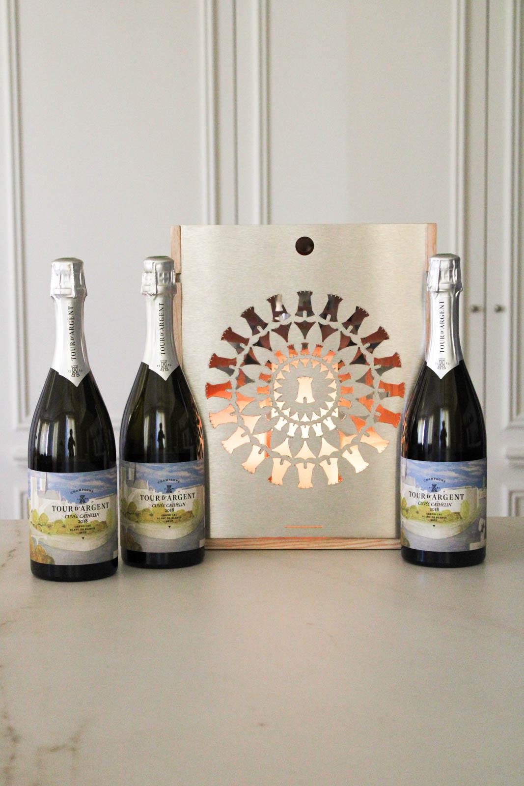 Arborant le logo de la Tour d’Argent, ce coffret renferme trois bouteilles de champagne de la prestigieuse cuvée Cathelin Grand Cru 2018. Cette cuvée mythique, élaborée par Julien Barbier de R&L Legras, est issue exclusivement de la parcelle « Les Crosauts » sur la commune de Chouilly, au sein de la prestigieuse Côte des Blancs.
