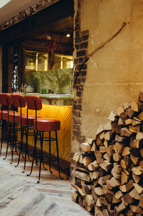 Outre son design simple signé Martin Brudnizki - des chaises en bois, des murs en briques, des verrières donnant sur le passage exigu de la Main d’Or, des tables en marbre, quelques banquettes en cuir rouge style dinner américain - East Mamma pourrait se définir par 5 objets faisant son identité :