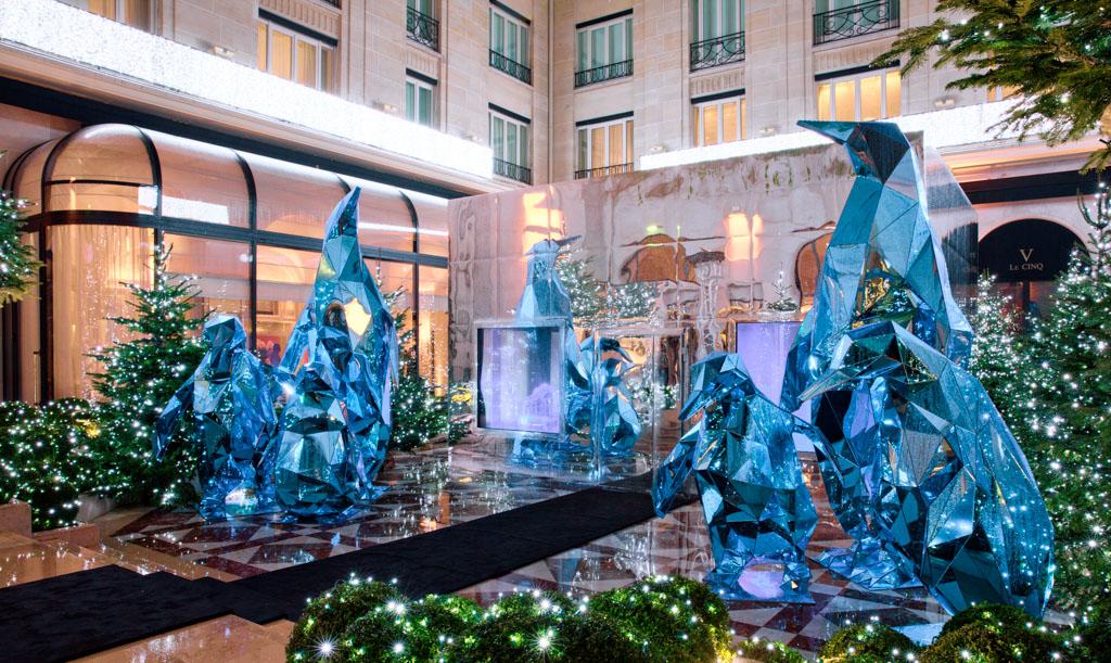 La très chic Cour de Marbre du Four Seasons George V Paris, déjà entourée de trois des meilleurs restaurants du 8ème arrondissement (Le Cinq, la table haute-cuisine trois étoiles de Christian Le Squer ; l’italien chic Le George, désormais sous la houlette de Simone Zanoni et l’excellentissime Orangerie de David Bizet) fait l’événement cet hiver en dévoilant un Ice Lounge exclusif imaginé par son emblématique directeur artistique et maître ès fleurs de l’hôtel, l’irremplaçable Jeff Leatham.