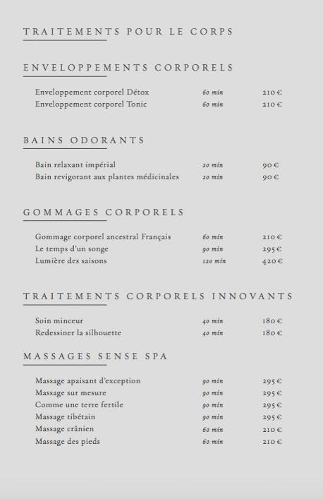 Extrait de la liste des tarifs du spa © Rosewood
