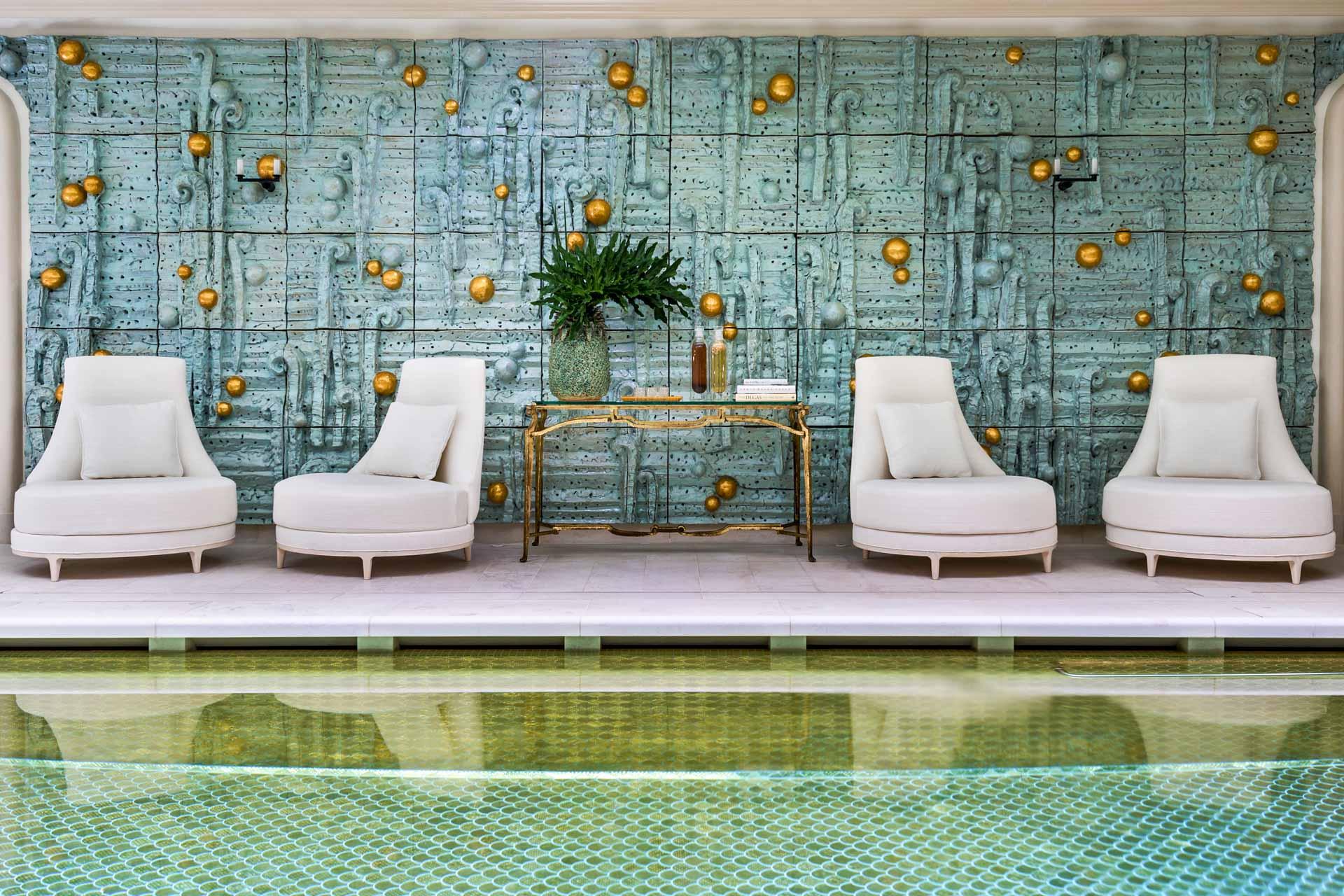 Une fois les formalités initiales accomplies, Sylvie, la thérapeute qui m'a été assignée, m’invite à emprunter l’escalier pour descendre d’un étage. Je découvre alors le second espace du spa, plus richement décoré par Chahan Minassian [un autre décorateur de l'hôtel, NDLR] et offrant une impression de luxe inouïe avec sa profusion de marbre et ses camaïeux de bleu et de vert. Un coup d’œil à droite permet de découvrir la splendide piscine (réservée aux clients résidant à l’hôtel), longue de 14 mètres, éclairée par un puits de lumière naturelle et recouverte de plus de 17,000 écailles dorées. Voilà qui donne le la !