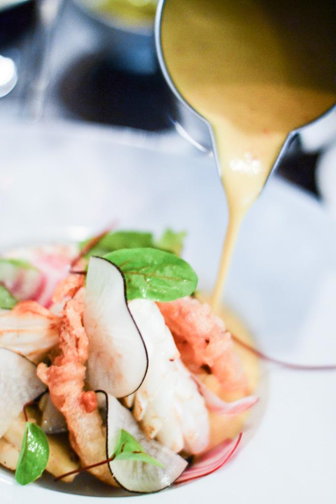 En entrée, on se laisse tenter par un encornet grillé, panais et condiment yuzu-citron. Le tout est accompagné d’un velouté de panais et peperoncino, un piment italien qui vient relever le goût et des pickles de radis noir pour le croquant. La tête de l’encornet servie en tempura est une pure gourmandise. De belles associations de saveurs et de texture pour cette entrée joliment exécutée.