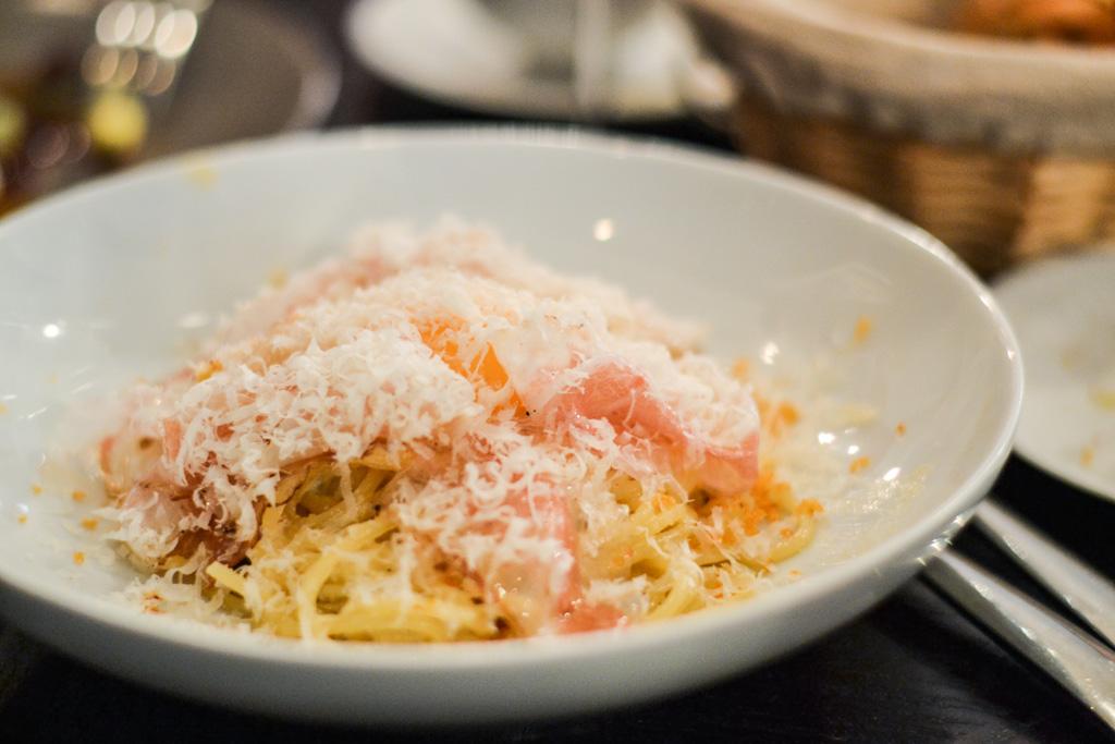 Pour le plat, le choix était déjà fait. On ne pouvait pas passer à côté des déjà cultes spaghetonni alla carbonara, la recette véritable, avec œuf et sans crème fraîche. Les pâtes faites à la main chaque matin par le chef sont servies al dente avec son jaune d’œuf coulant, une émulsion d’oignon, guanciale et de la joue de porc si fine et délicate qu’elle caresse le palais.
