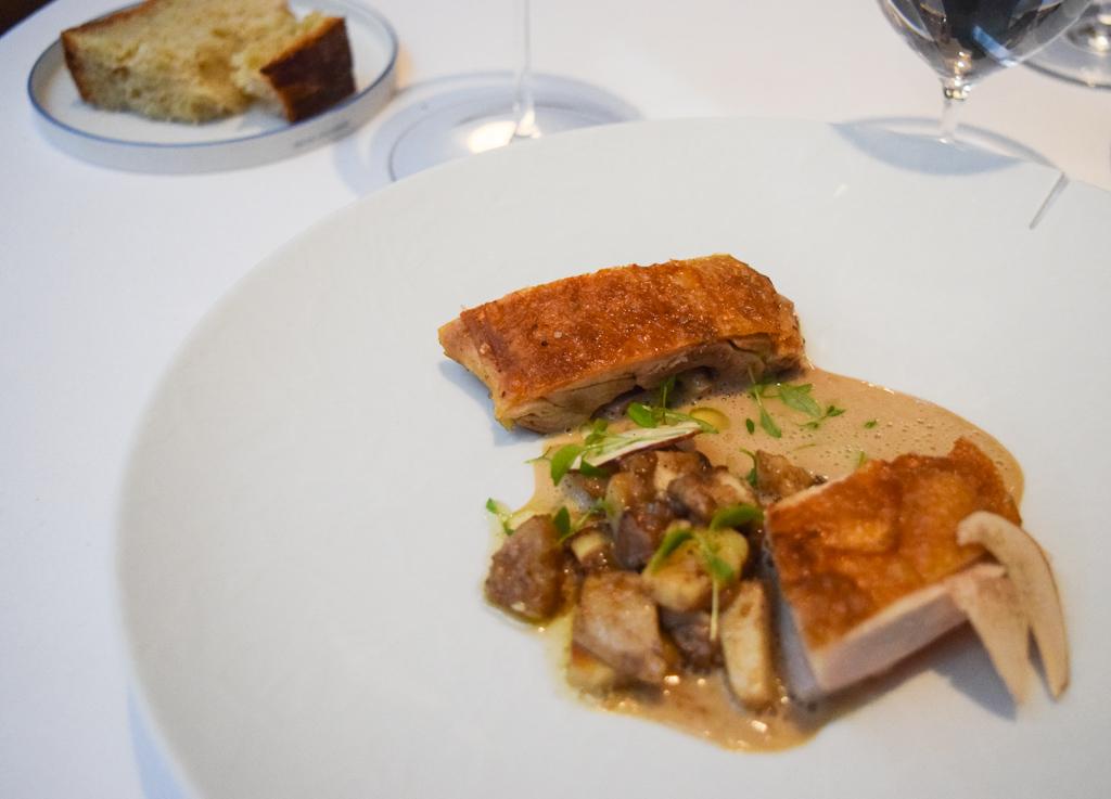 Même sensation sur la prochaine séquence, une poularde de Bresse croquante à l’extérieur, fondante à l’intérieur, servie avec une sauce aux cèpes et des cèpes de saison. La cuisson de la volaille est impeccable, évoquant une version gastronomique de certains chicken rice avalés avec gourmandie en Asie. La sauce est royale. Les cèpes, particulièrement bienvenus en plein automne. Pourtant on ne peut s’empêcher de penser qu’il manque un petit quelque chose à l’assiette pour la sublimer.
