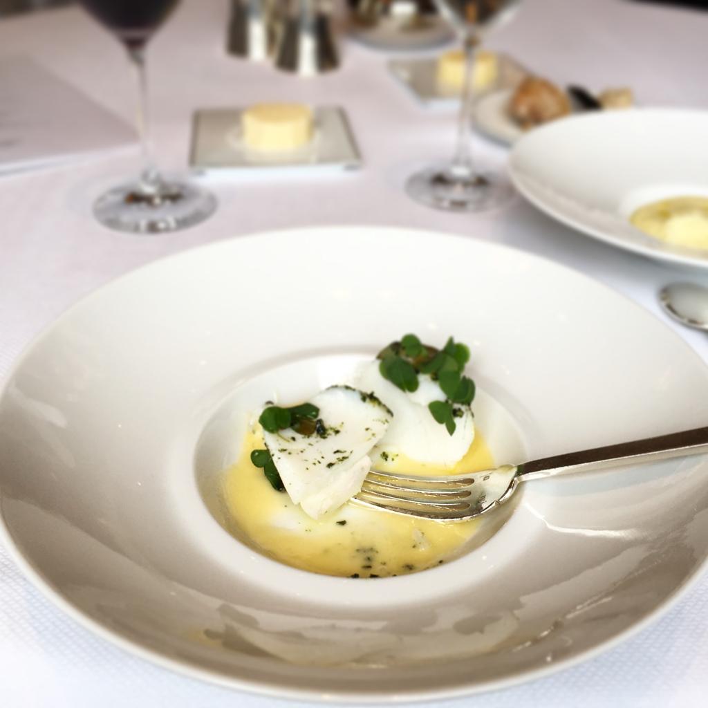 Enfin, ce qui restera, de notre point de vue, le chef d’œuvre de ce déjeuner : le cabillaud aux algues, avec une sauce au beurre blanc et zeste de citron vert, accompagné d’une purée à l’huile d’olive. Le poisson est sublime, parfaitement nacré en son cœur. La composition va à l’essentiel, ne se perd pas dans une sophistication superflue. L’exécution est magnifique, le produit sublimé à l’extrême. Voilà le genre de plats dont on se rappellera encore dans plusieurs années. La preuve que la haute cuisine, celle qui se voit récompensée de trois étoiles par le Michelin, sait aussi rester simple et accessible.